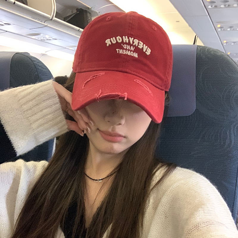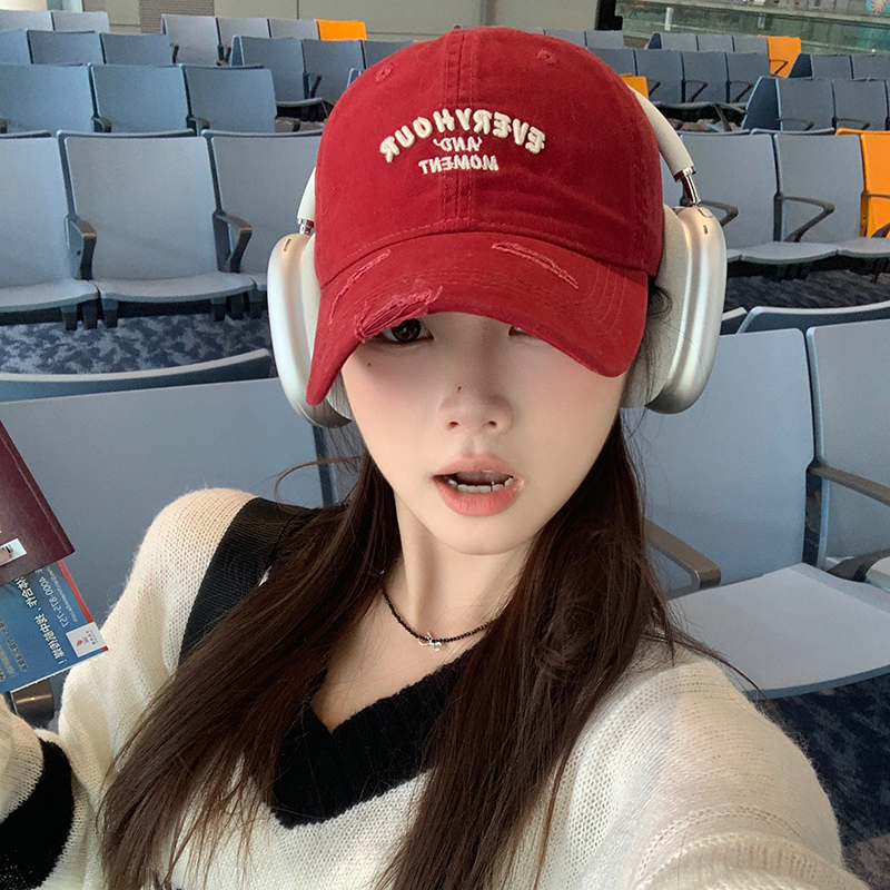 美式复古红色棒球帽子女秋冬做旧破洞字母鸭舌帽男款大头围情侣款