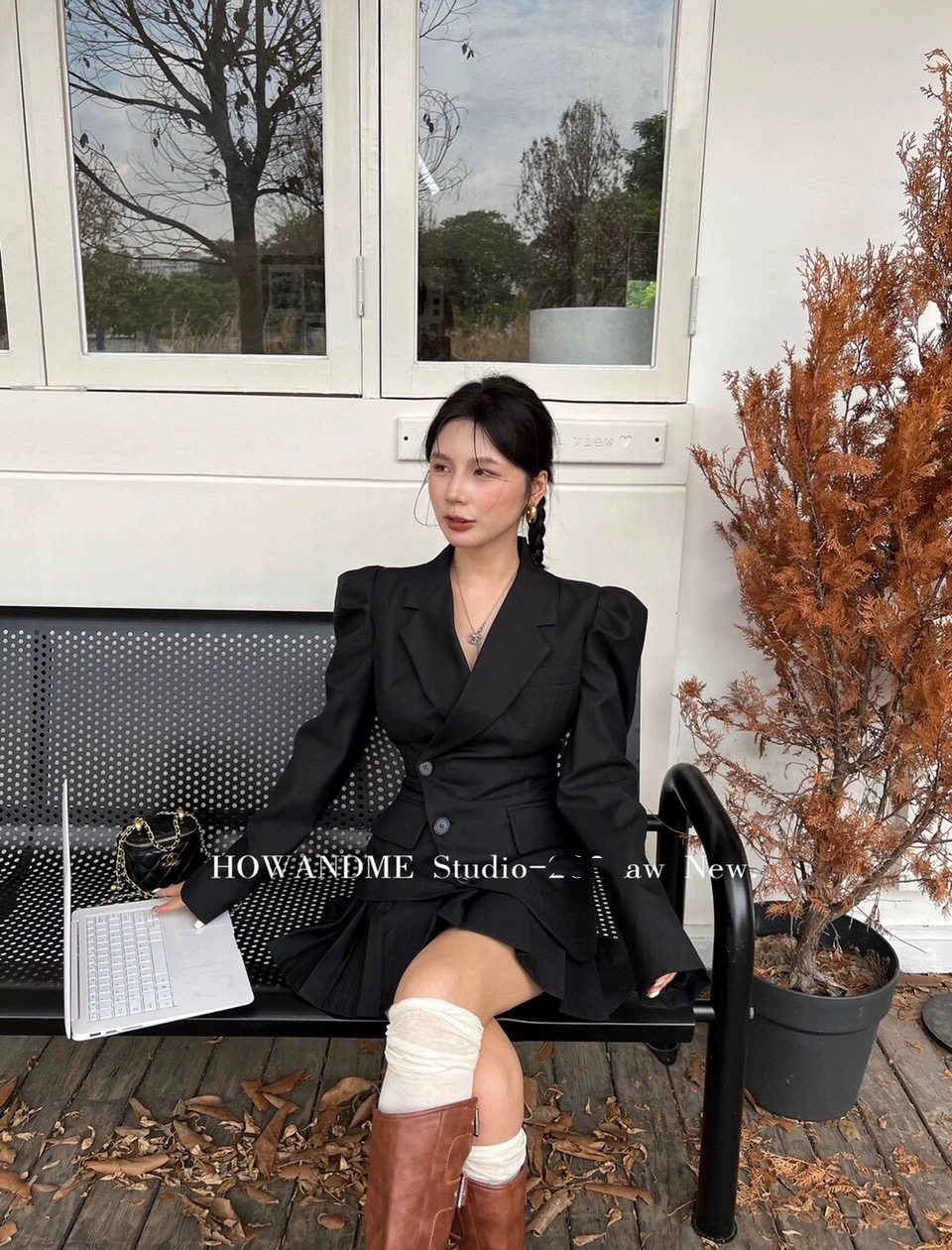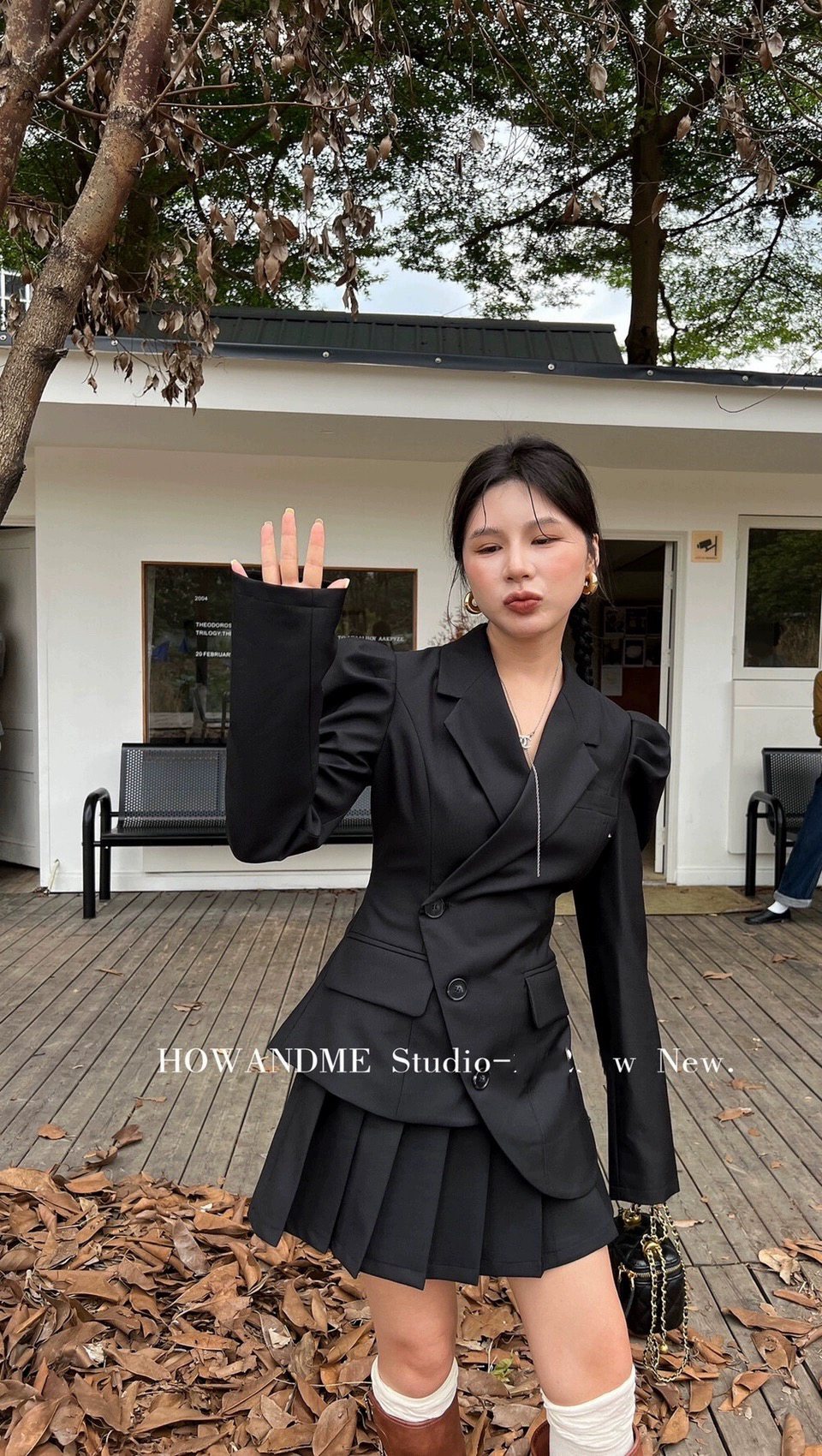 2025秋新款职场通勤上班OL泡泡袖斜扣西服高腰百褶裙套装气质女