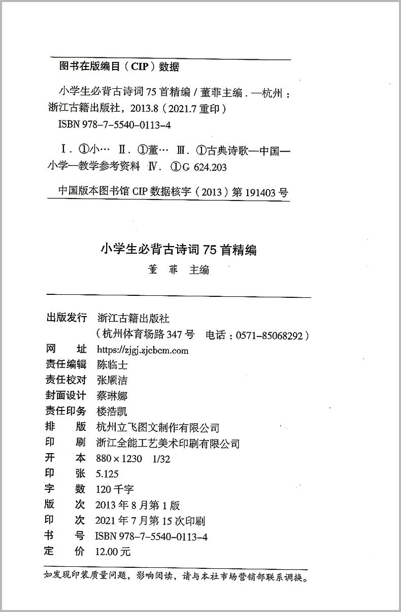 正版小学生必背古诗词75首精编浙江古籍出版社小学生语文一二三四五六年级少儿童经典必读诵读国学 学习鉴赏教辅书籍