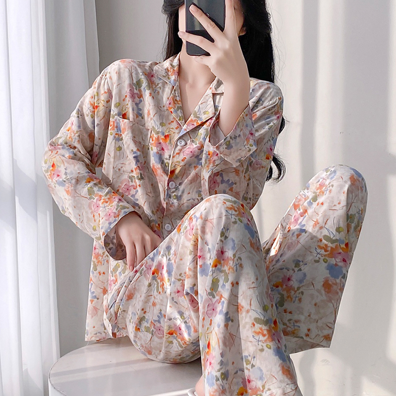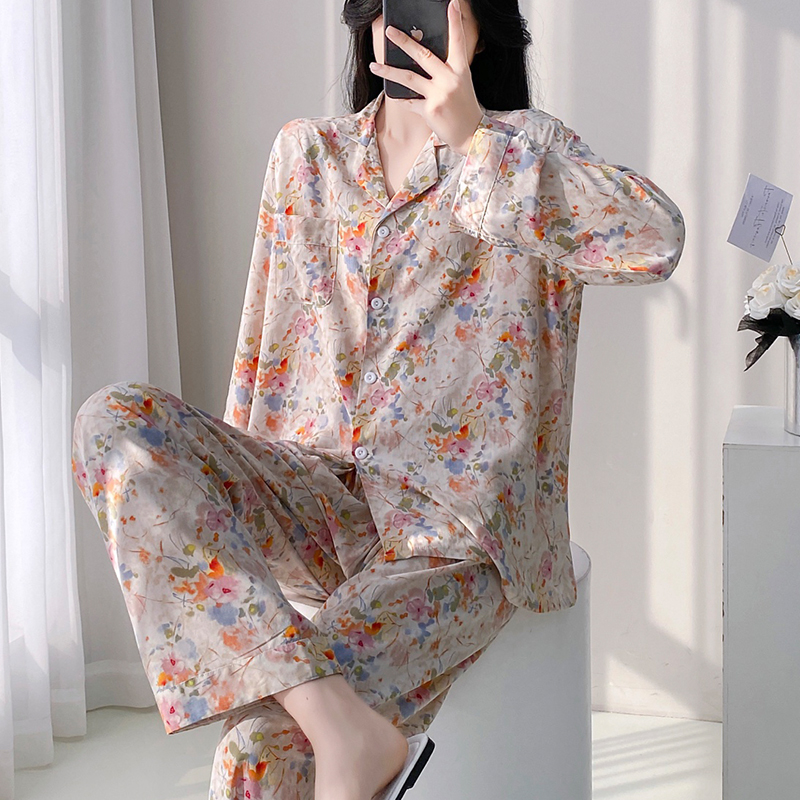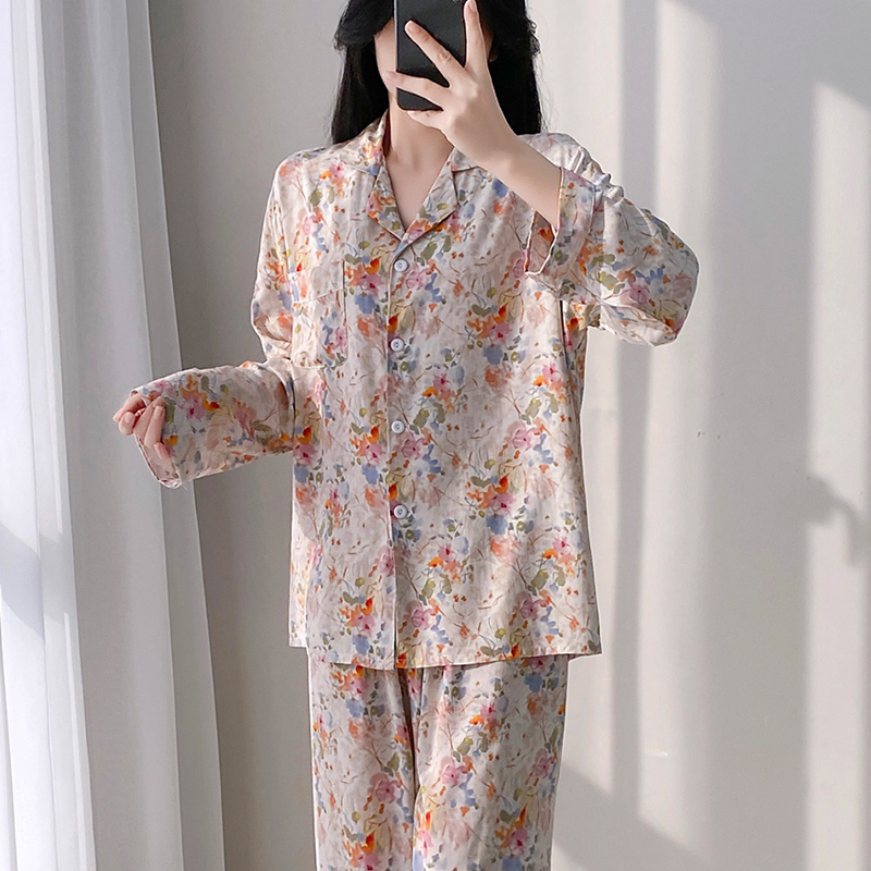 高级感夏季长袖棉绸睡衣女开衫大码绵绸宽松家居服套装人造棉春夏