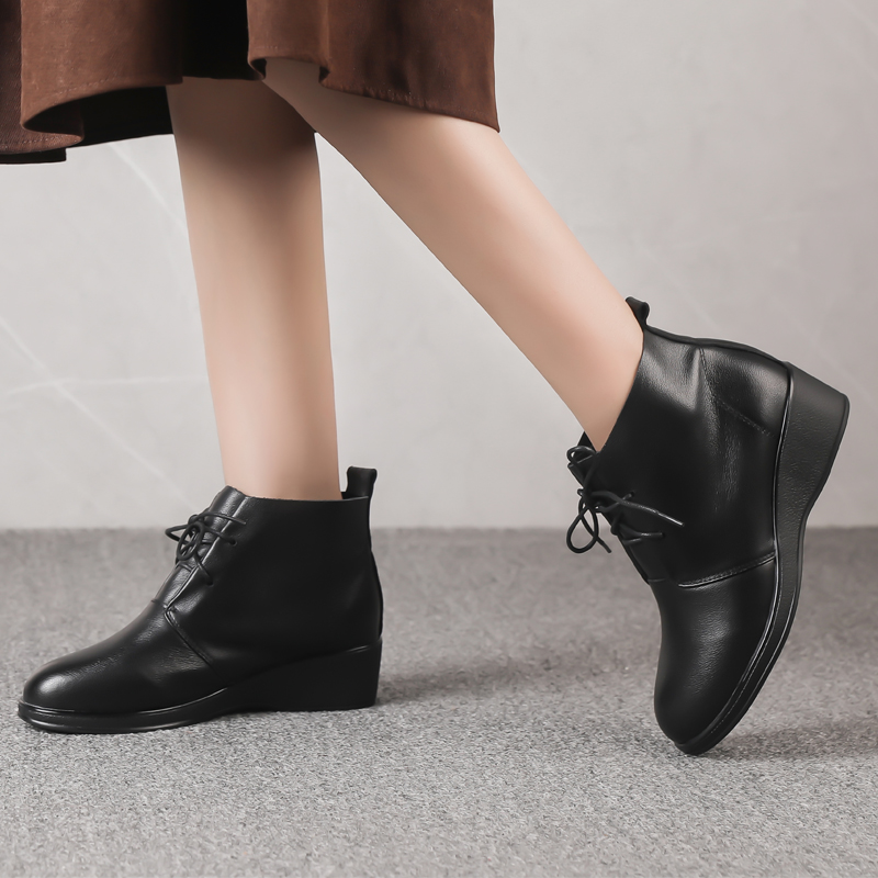 英伦风百搭秋冬保暖棉靴子时尚系带坡跟短靴通勤鞋妈妈工作鞋春秋