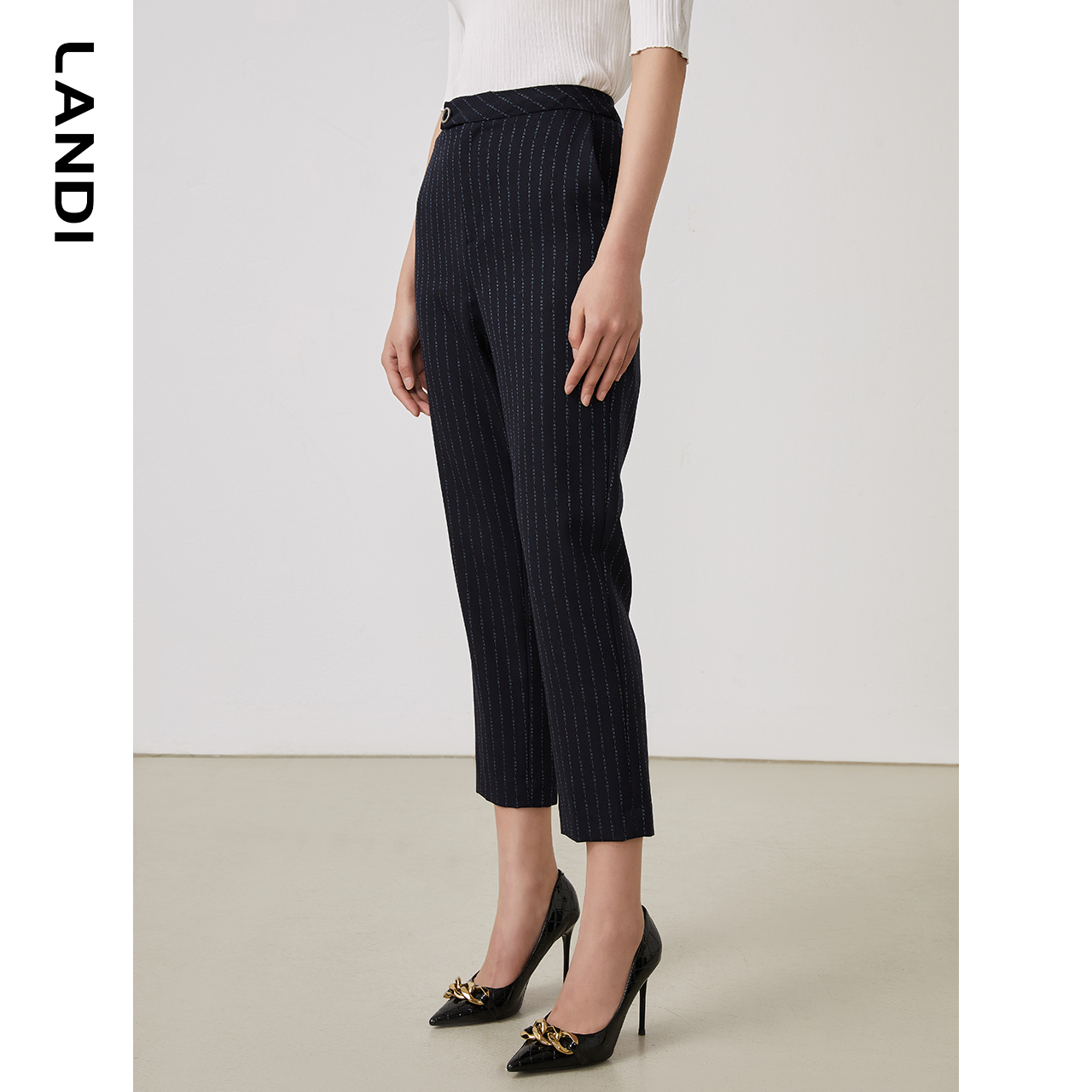 LANDI藏蓝色条纹羊毛九分西装裤女春季新款修身小脚裤