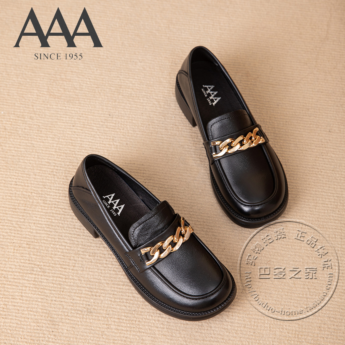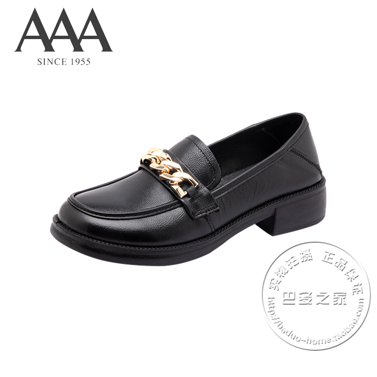 AAA女鞋牛皮鞋纳帕皮肤纹理面粗金属链条装饰低跟真皮深口单鞋