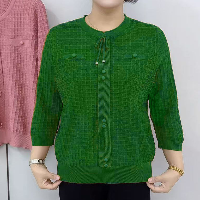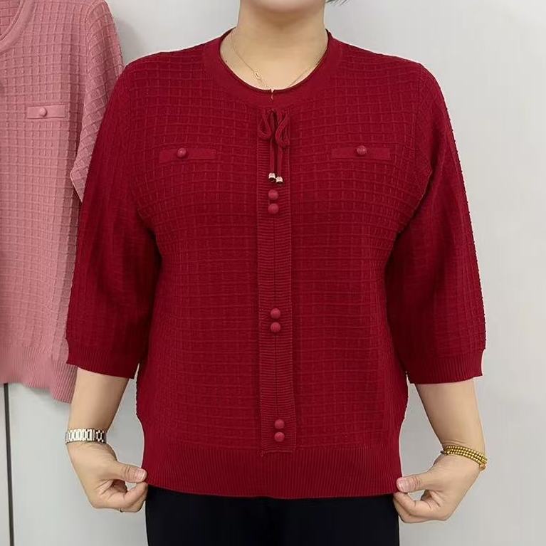 2025春夏新款时尚百搭纯色七分袖大码妈妈衫休闲针织上衣减龄毛衣
