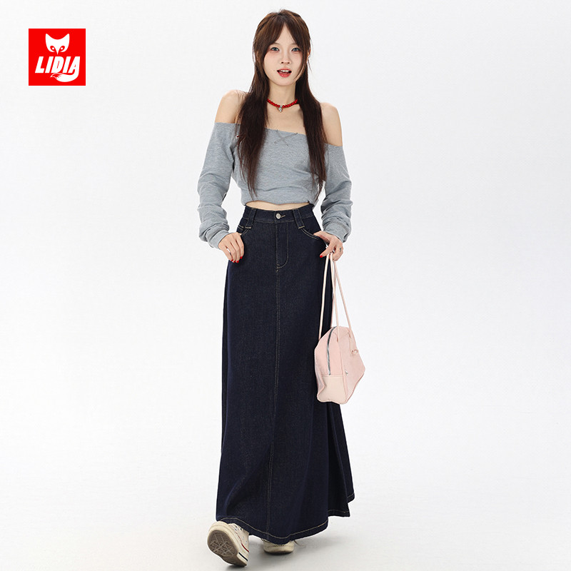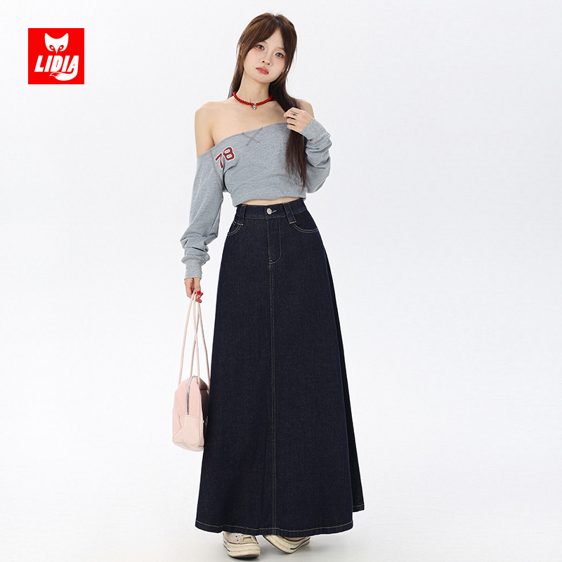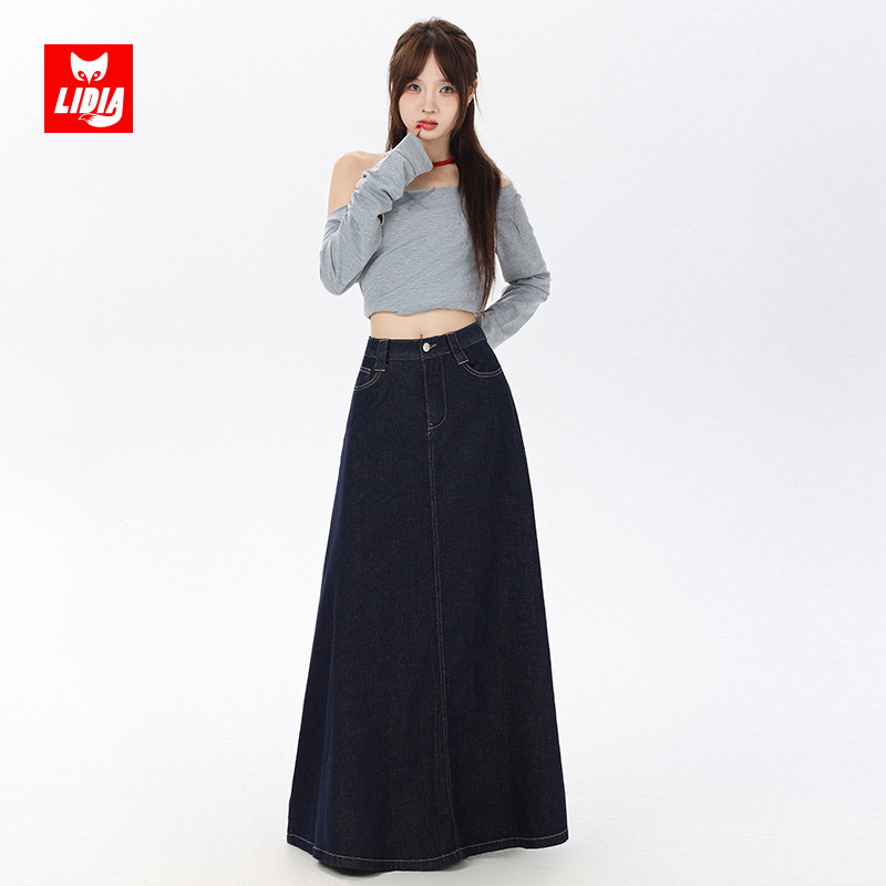 深蓝色牛仔半身裙2025年秋冬新款原色复古高腰a字长款大摆伞裙子