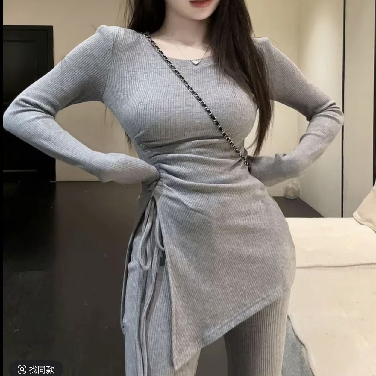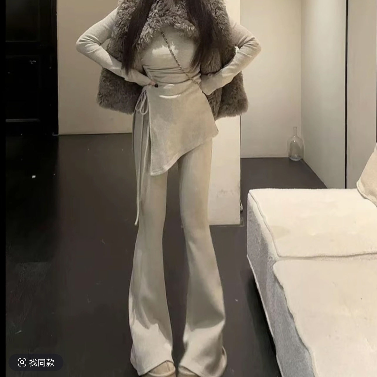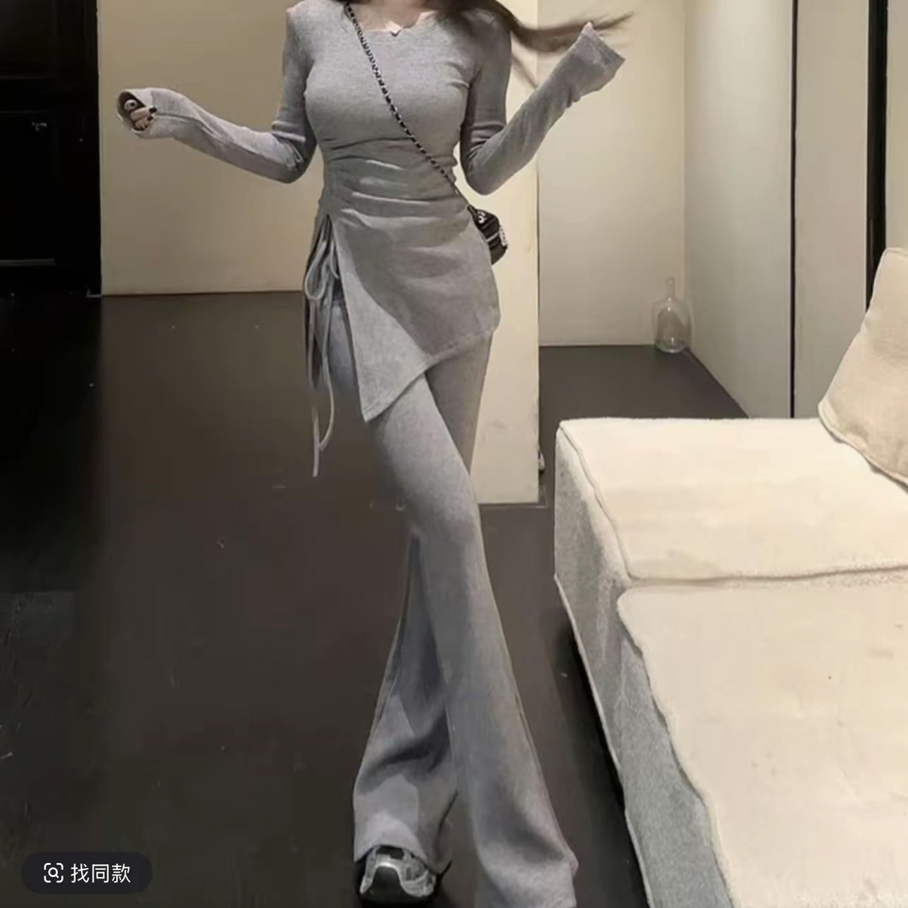 时尚休闲套装女秋冬季韩系不规则抽绳收腰上衣高腰阔腿长裤两件套