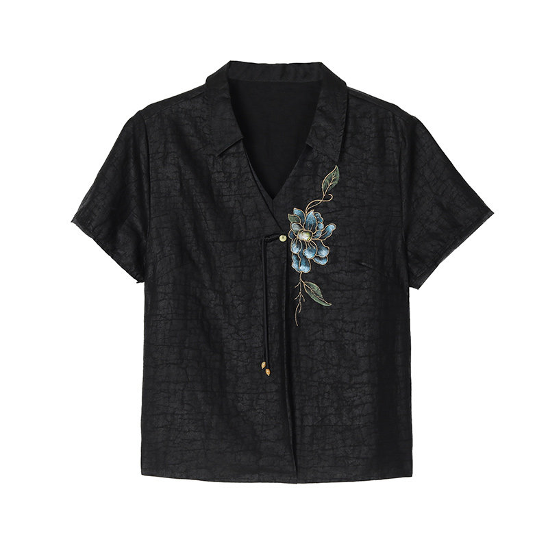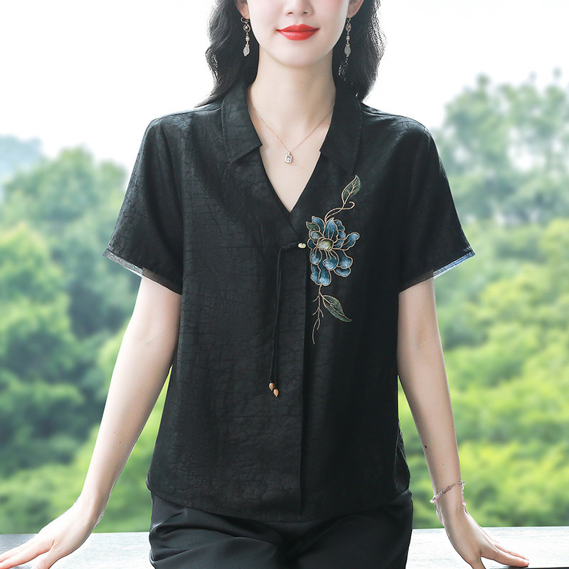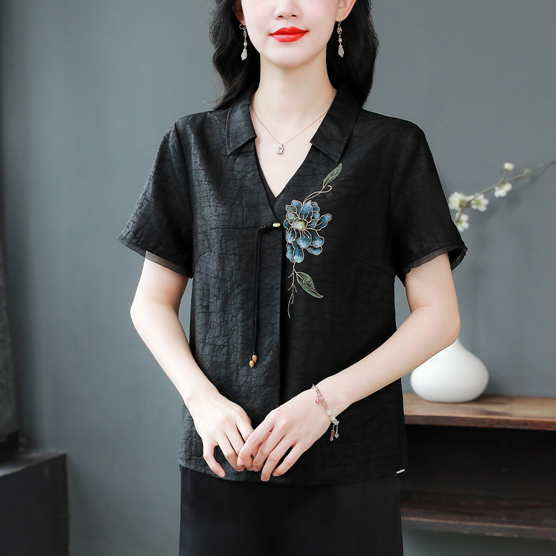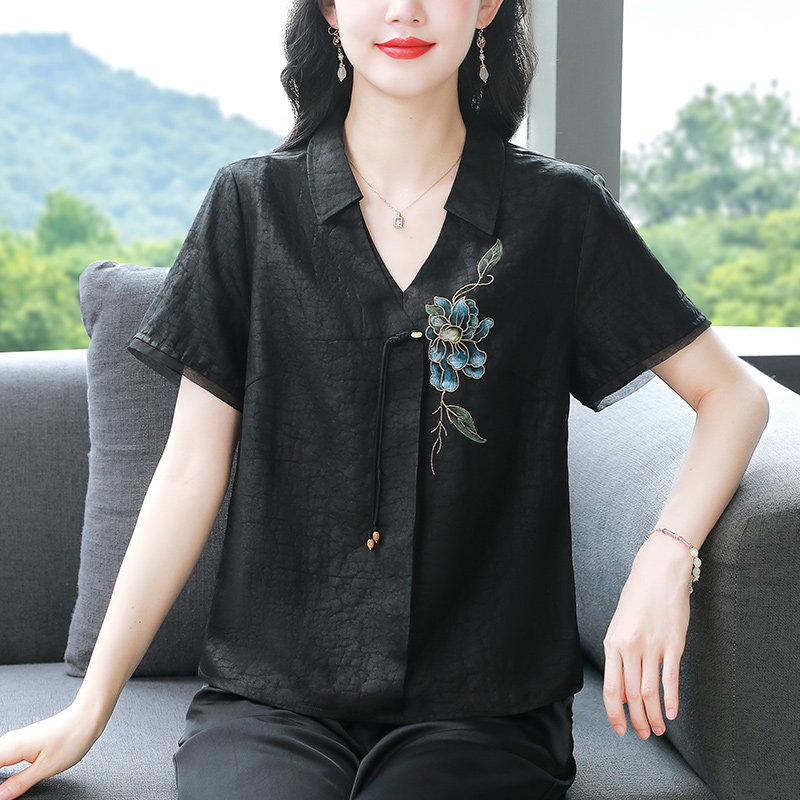 香云纱真丝印花V领短袖衬衫女夏季新款妈妈新中式复古桑蚕丝上衣t