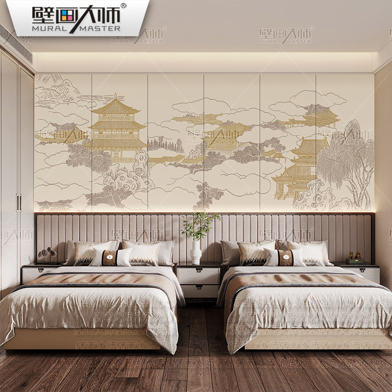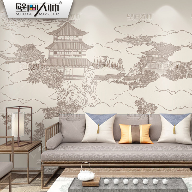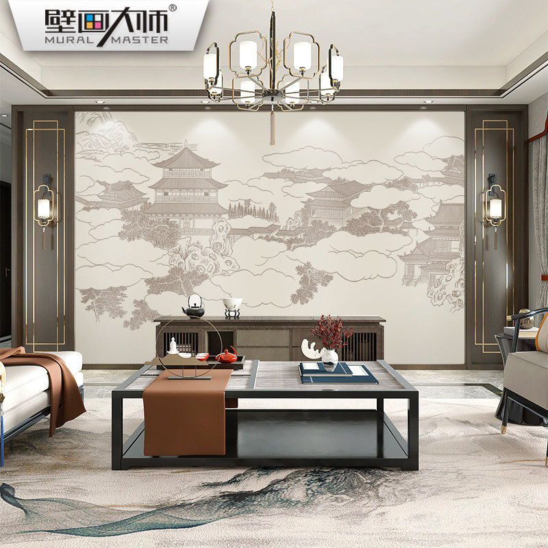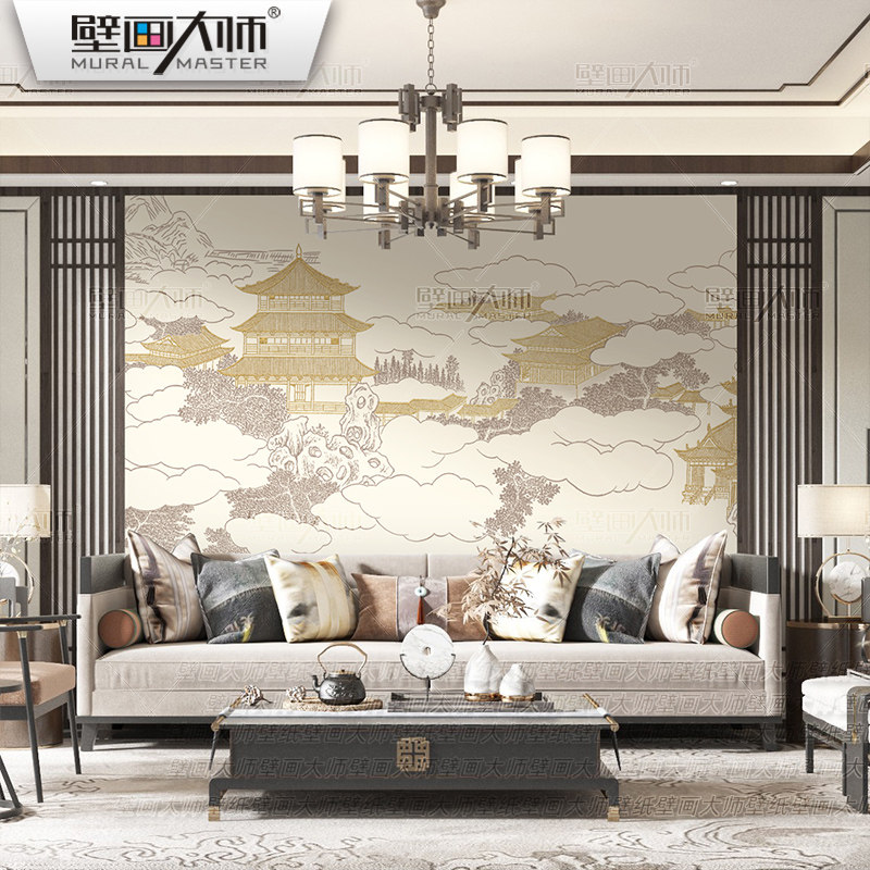 新中式楼阁壁纸山水壁布电视背景墙纸G硬包壁画饭店客饭厅装饰墙