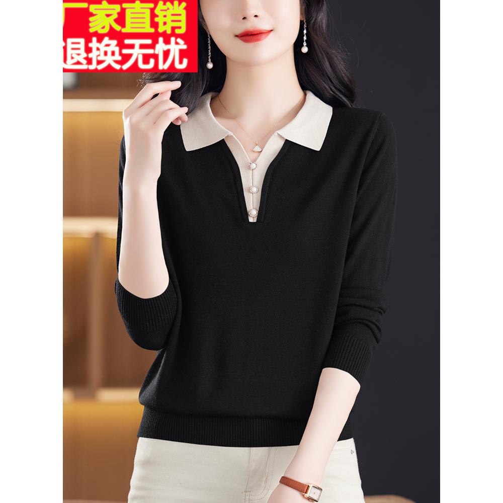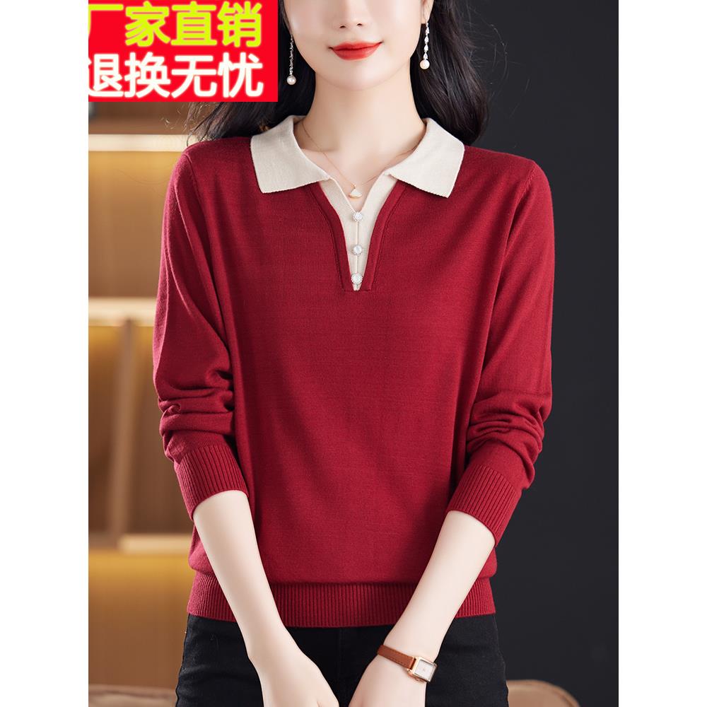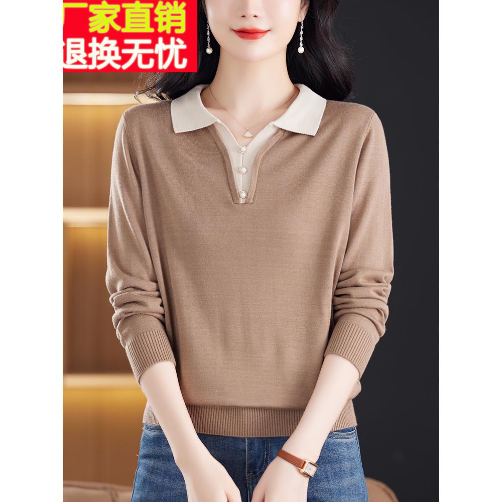 中年妈妈春秋新款羊毛衫女毛衣翻领长袖t恤宽松大码针织打底上衣