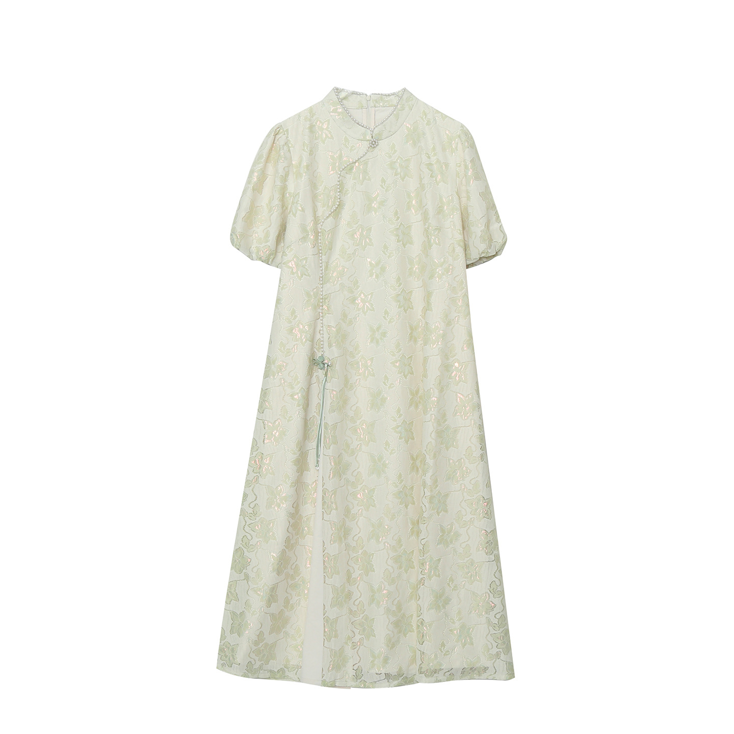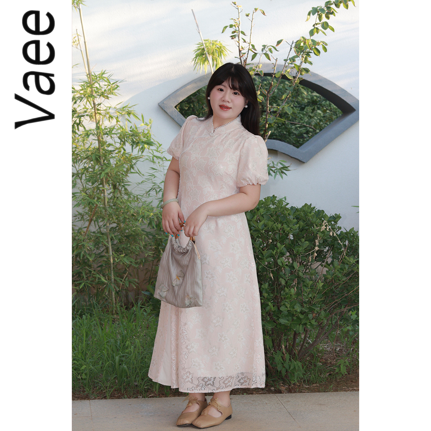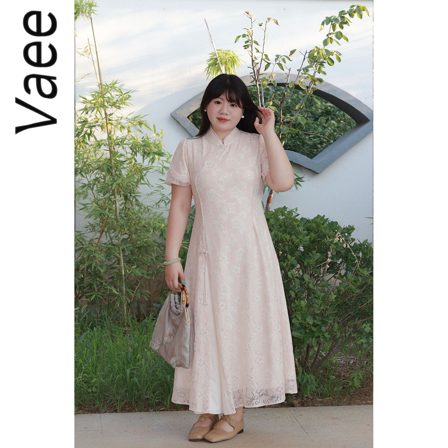 Vaee大码女装新中式气质收腰旗袍a字裙夏季新款温柔风蕾丝连衣裙