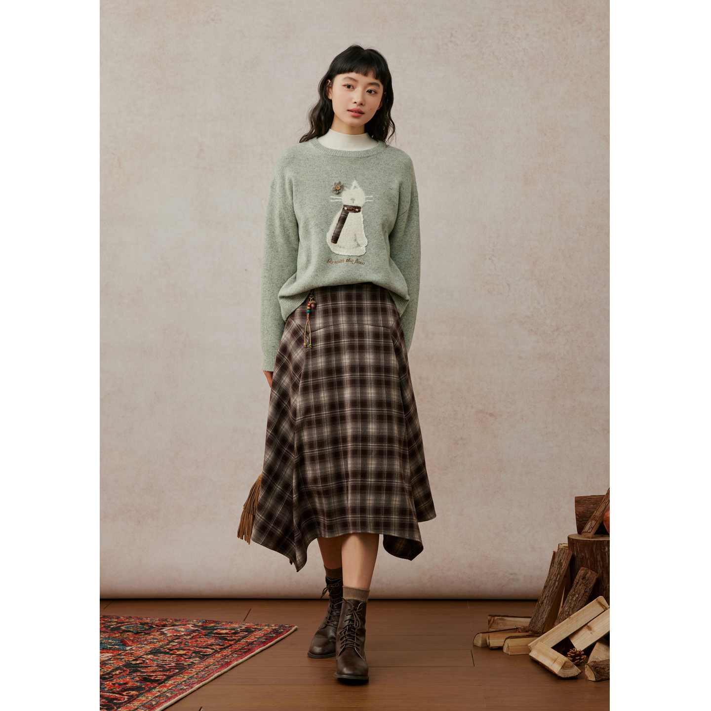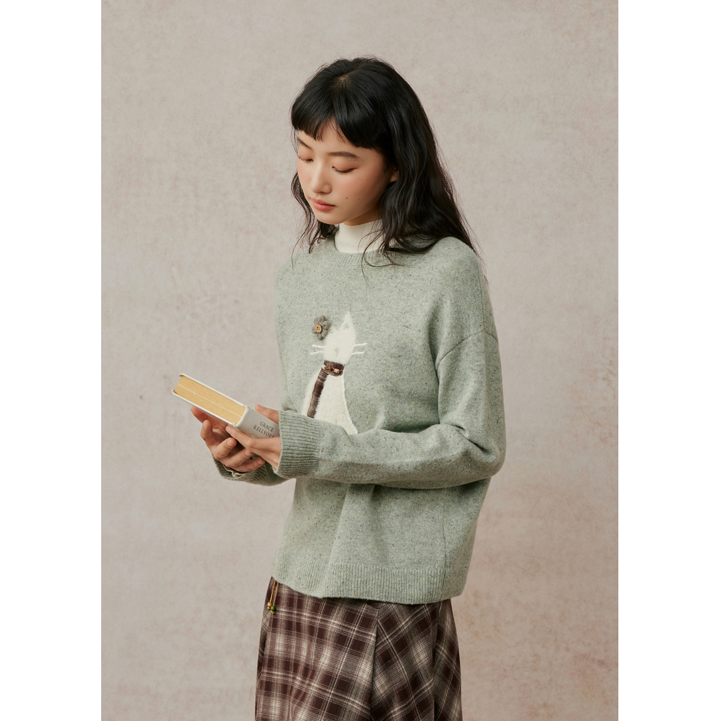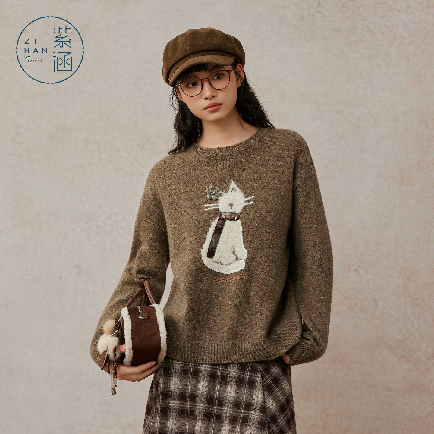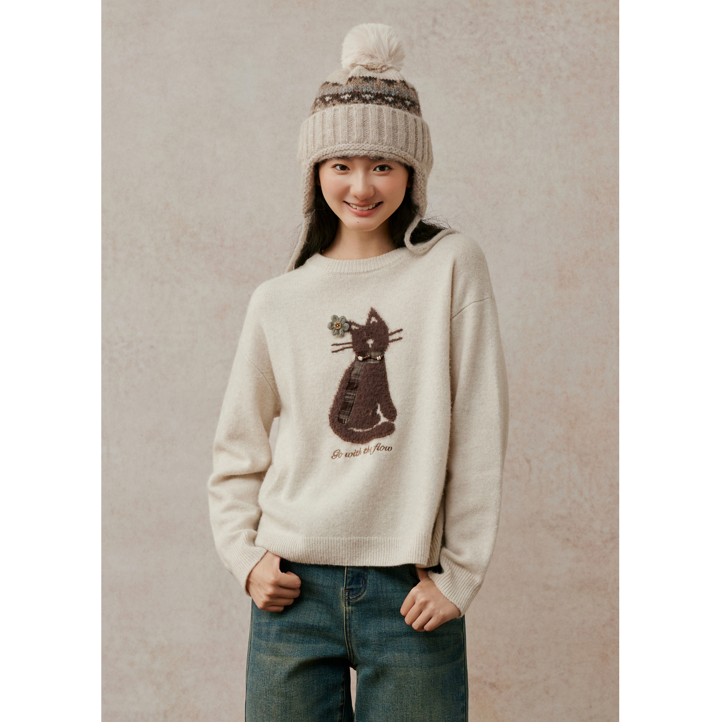 紫涵100%绵羊毛圆领针织衫女2025年冬季新款猫咪提花宽松套头毛衣