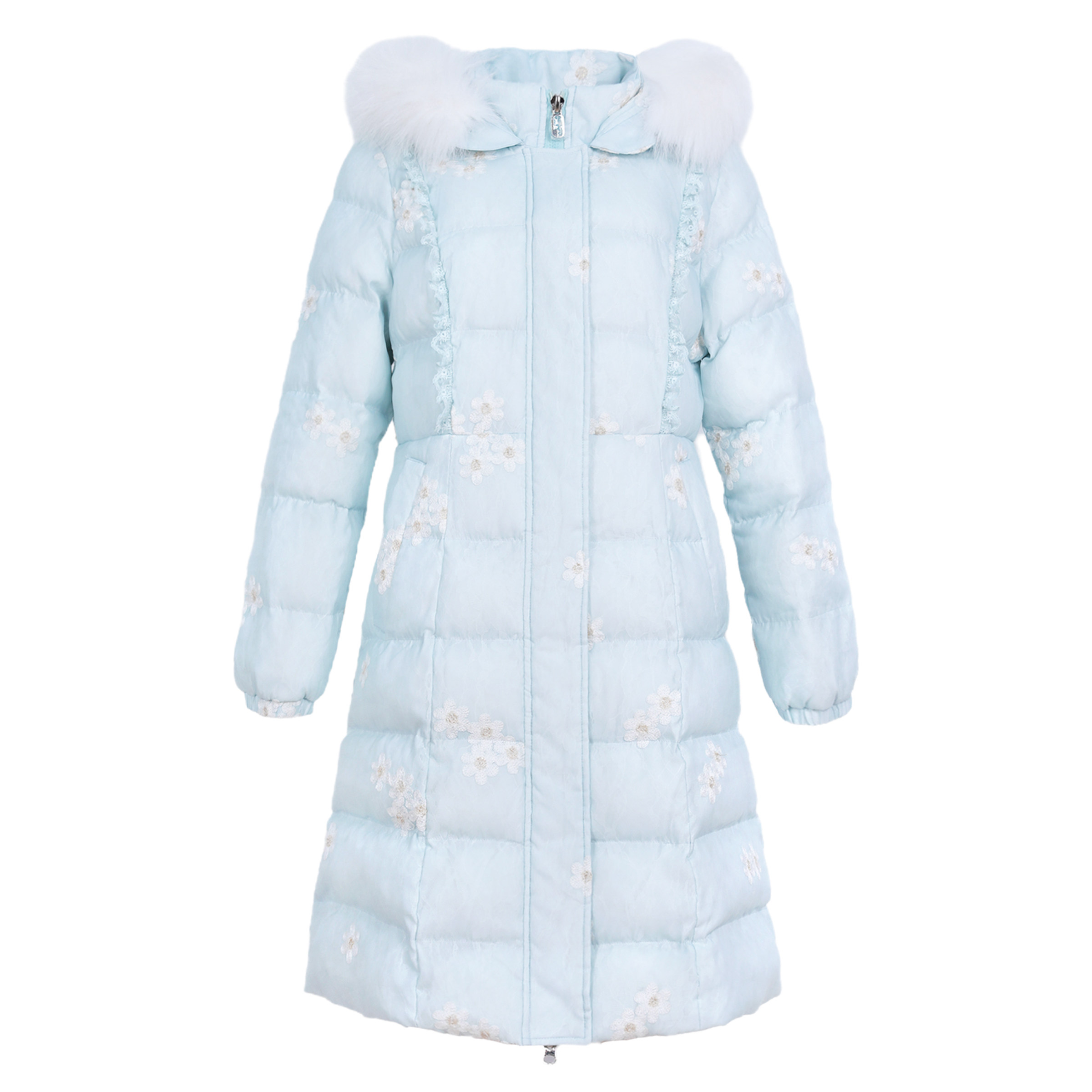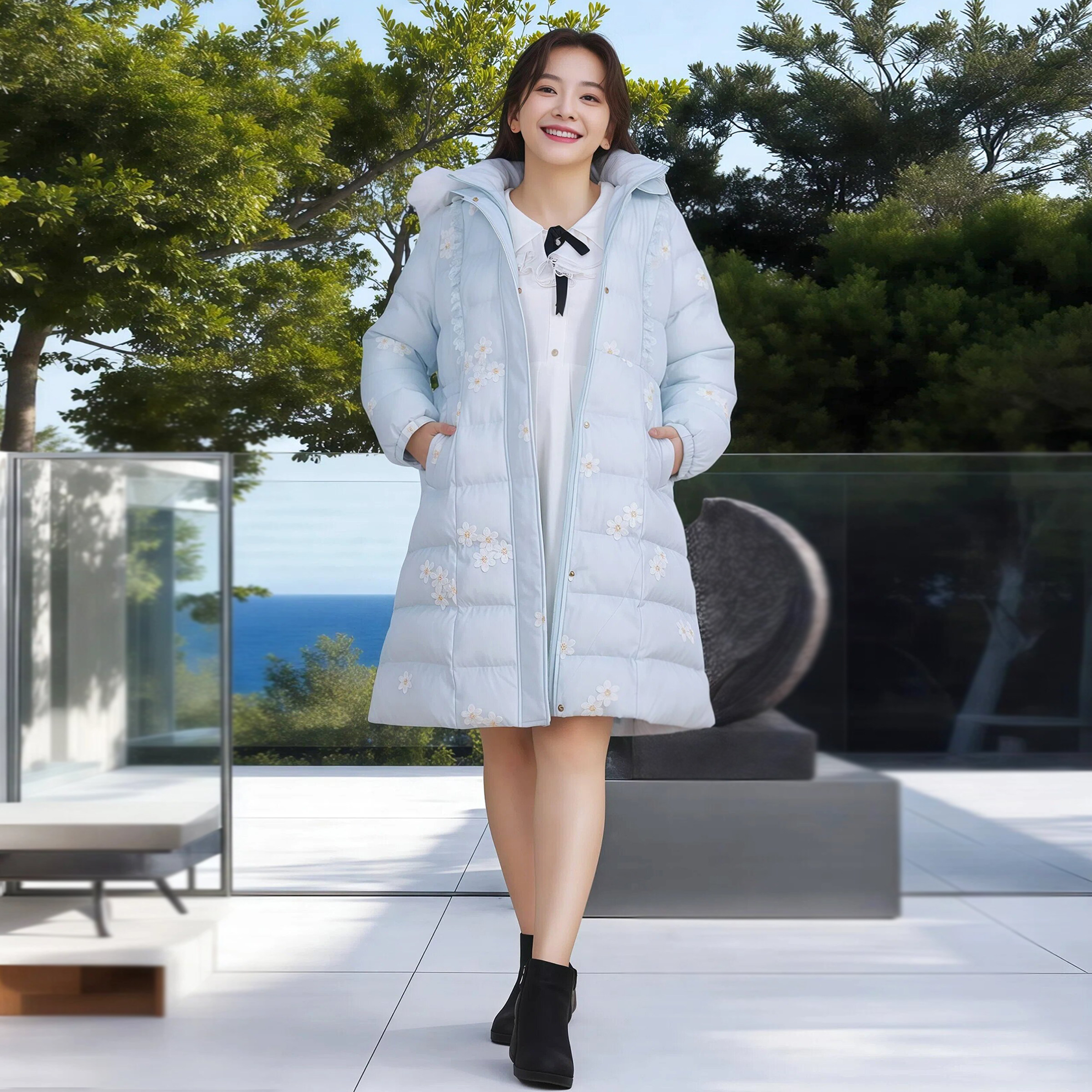 轻奢加大码女装冬装棉衣胖MM中长款毛领加厚保暖绣花浅蓝棉服外套