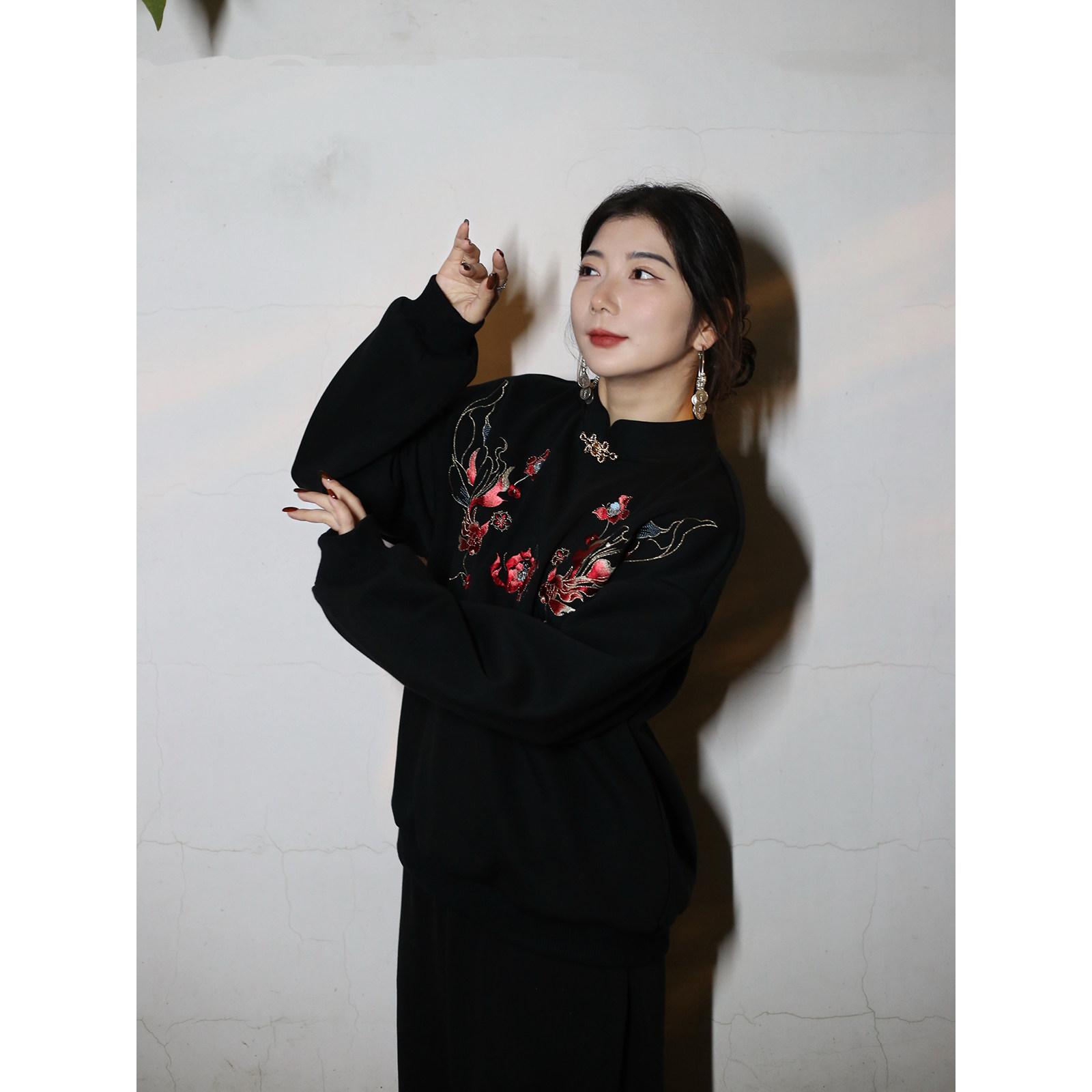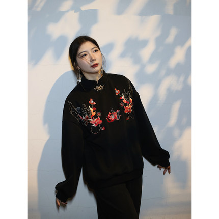 宽松套头假两件长袖锦鲤刺绣卫衣