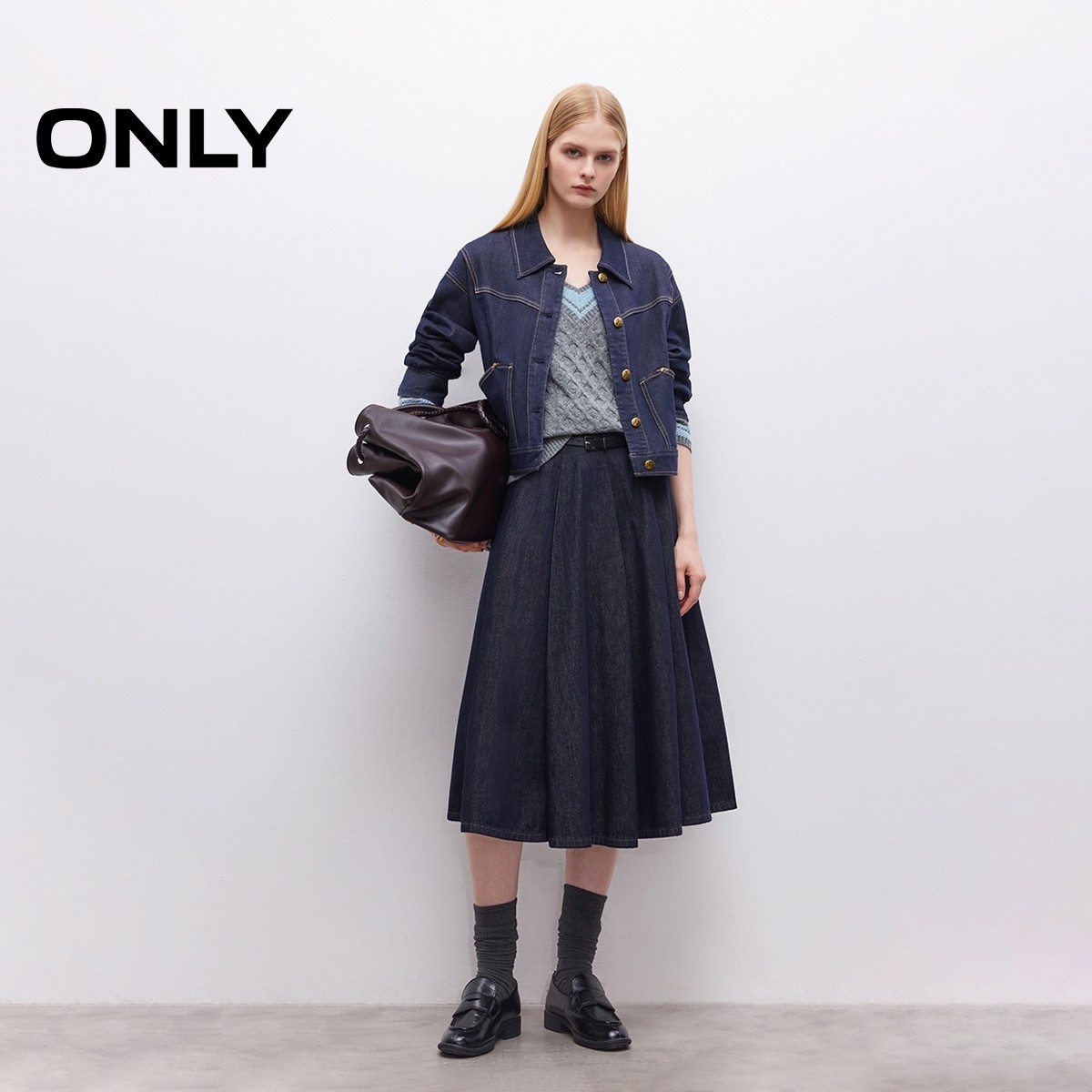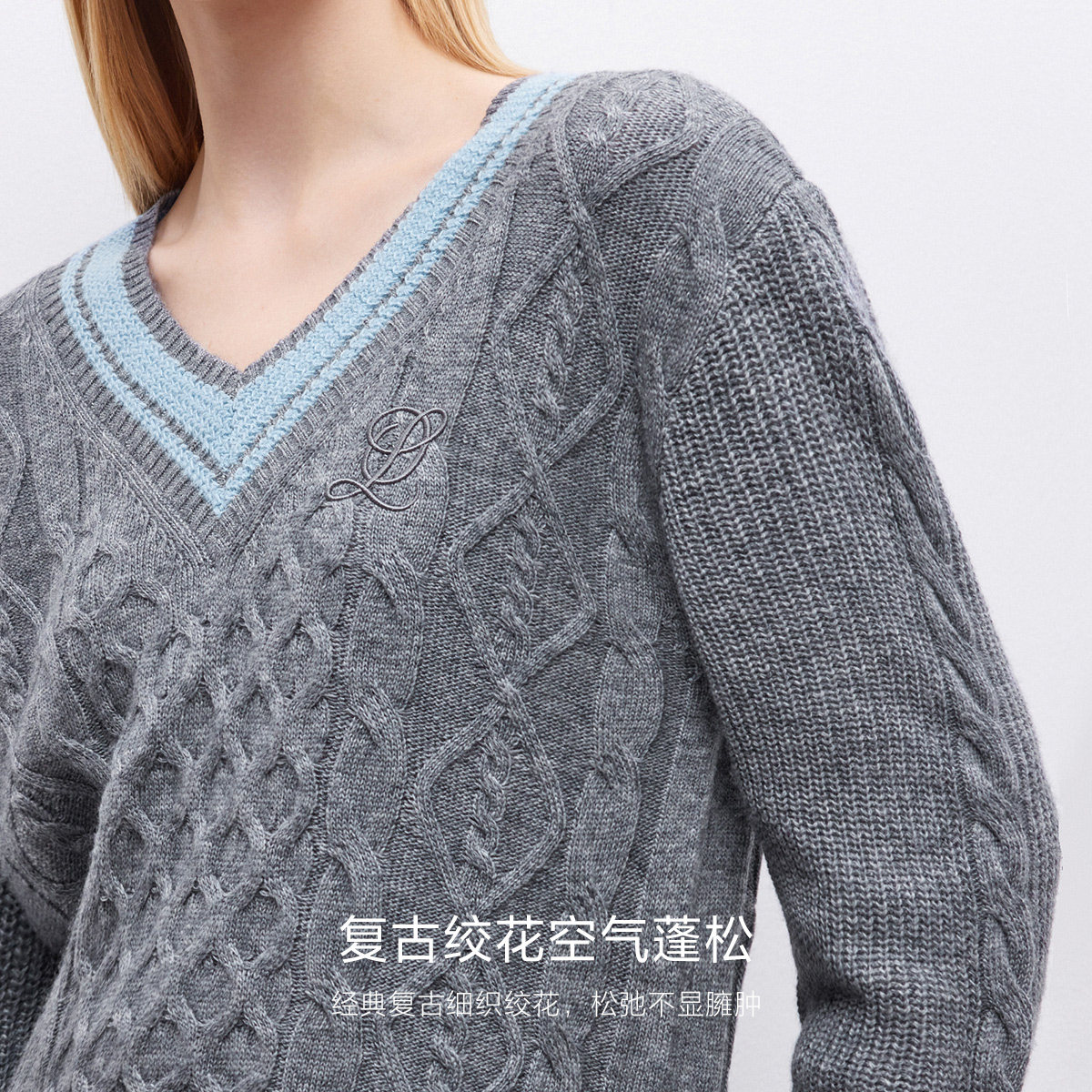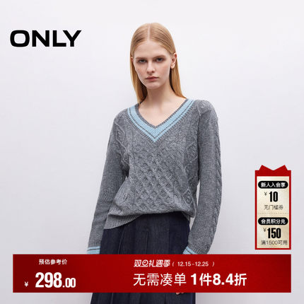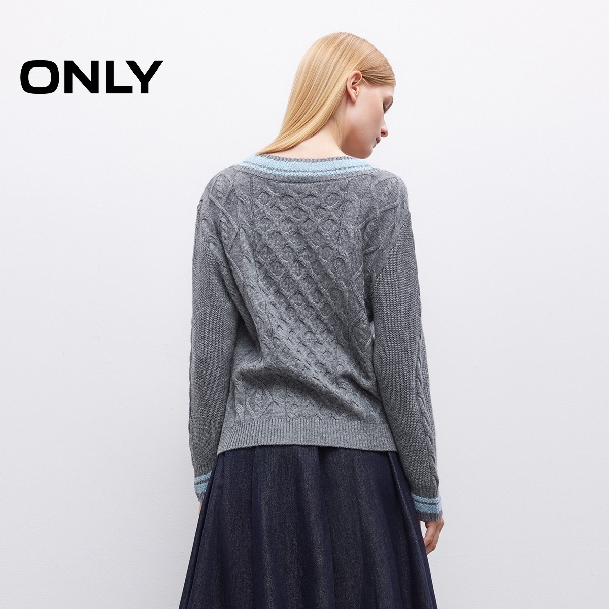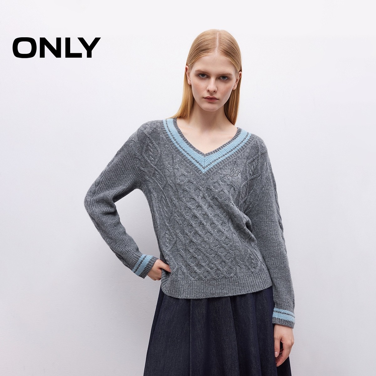 ONLY2025冬季新款含羊毛复古绞花编织柔软宽松V领毛衣针织衫女