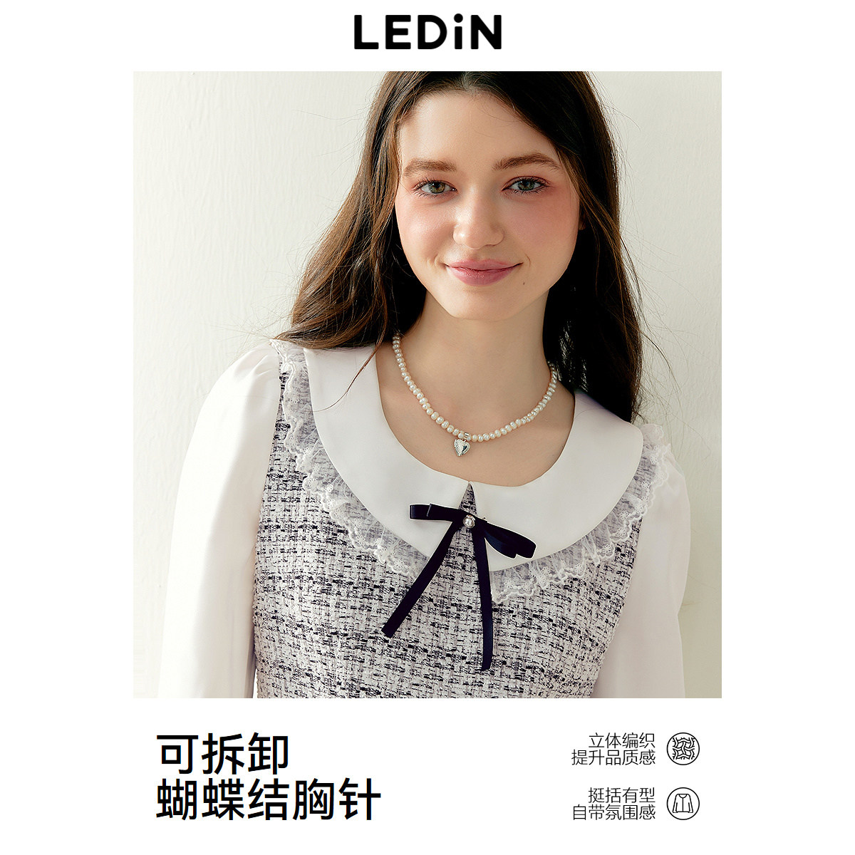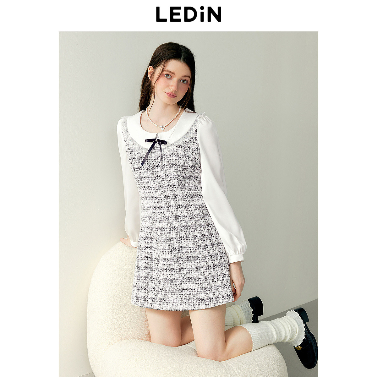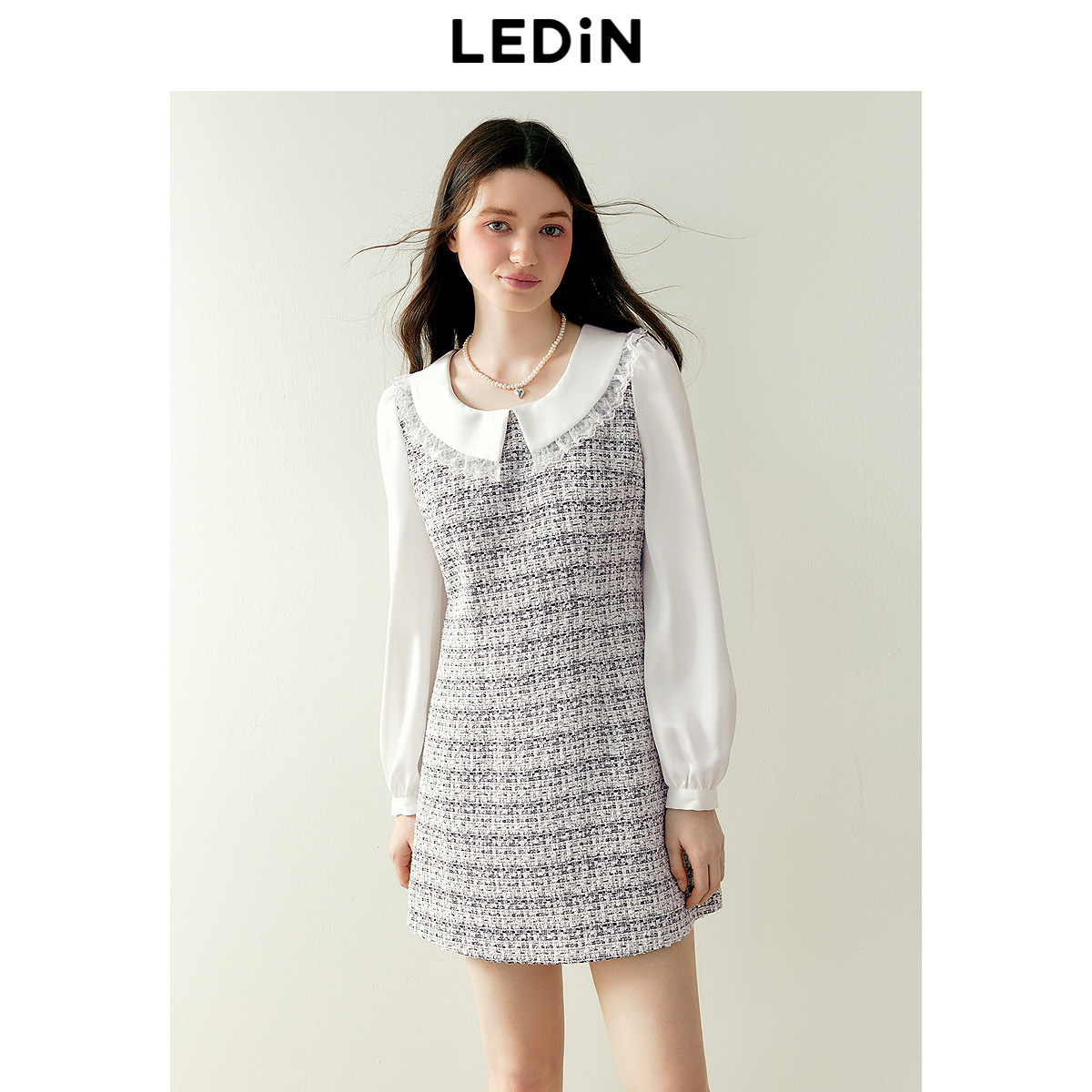 乐町甜美千金风连衣裙24春季拼接小香风气质花边领A版长袖连衣裙