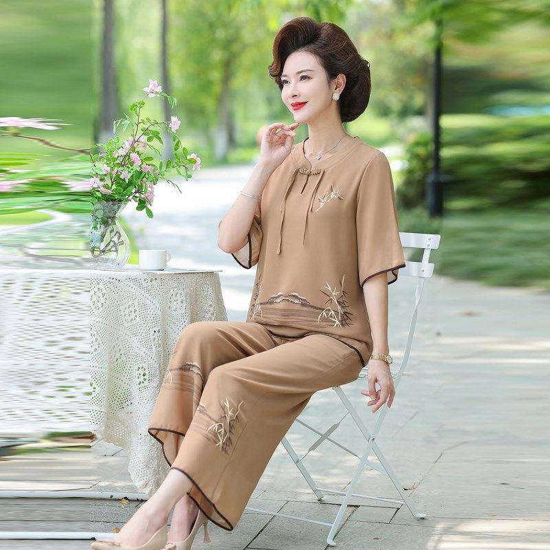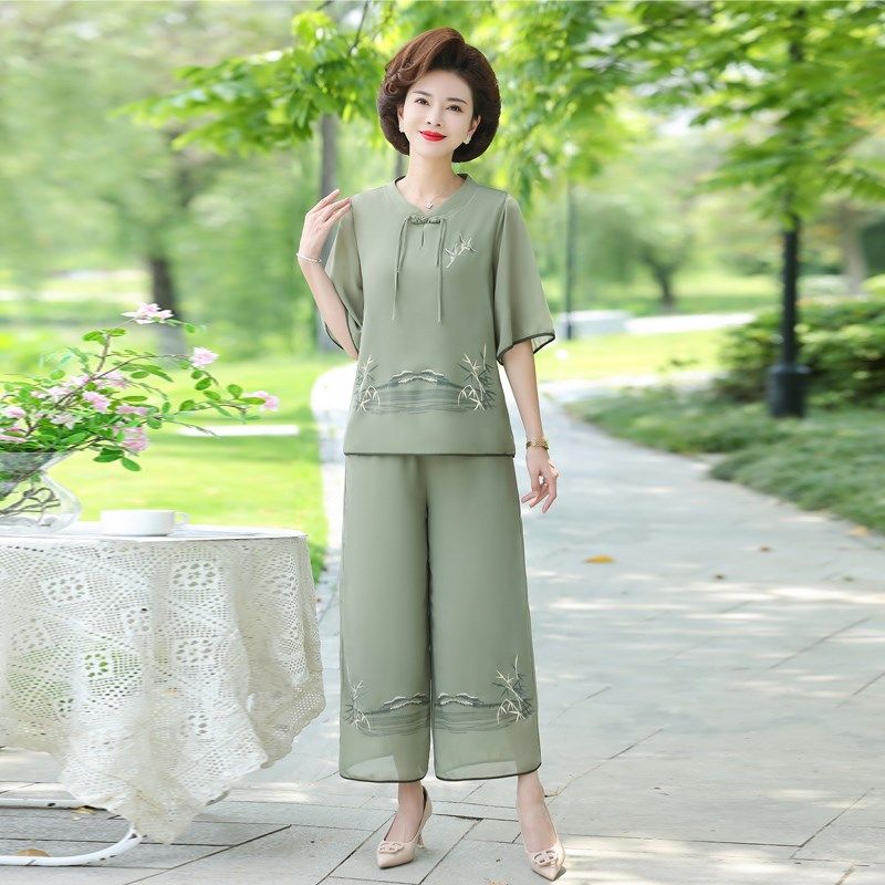 妈妈夏装雪纺套装中老年女士大码短袖t恤薄款中国风唐装小衫洋气