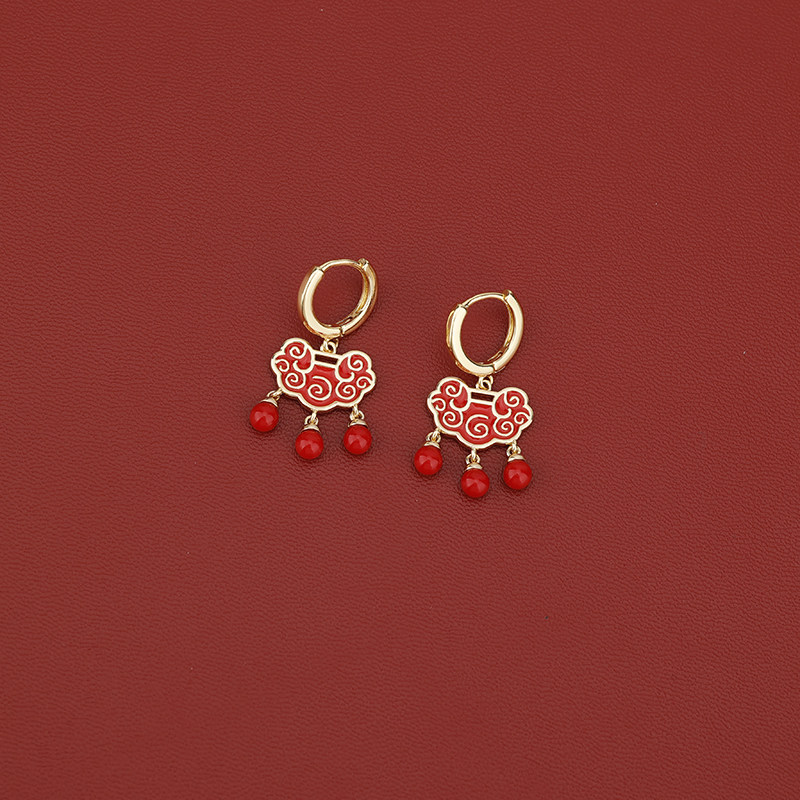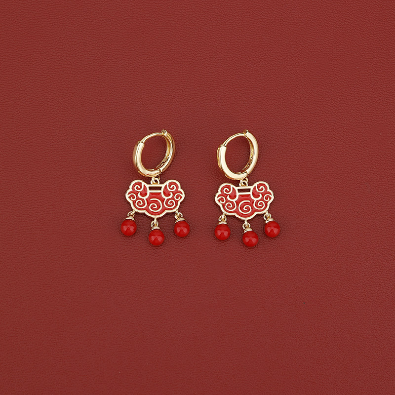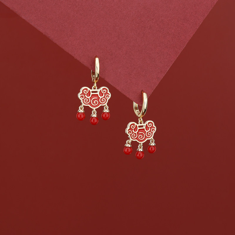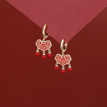 s925银针红色长命锁流苏耳扣气质2025年新款如意平安锁耳环气质潮