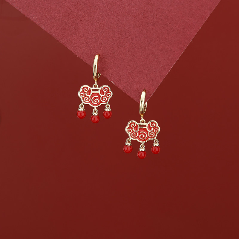 s925银针红色长命锁流苏耳扣气质