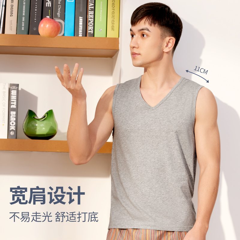 七匹狼纯棉宽肩带背心男士V领无袖汗衫鸡心领砍袖T恤高端全棉坎肩