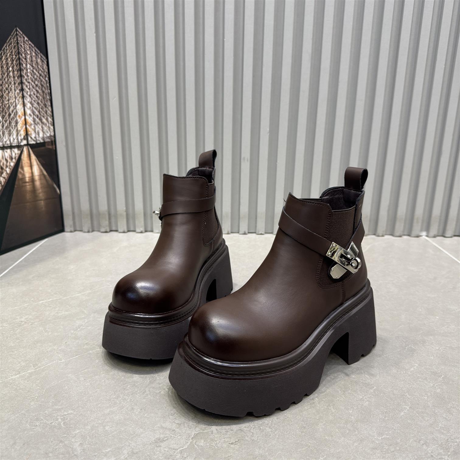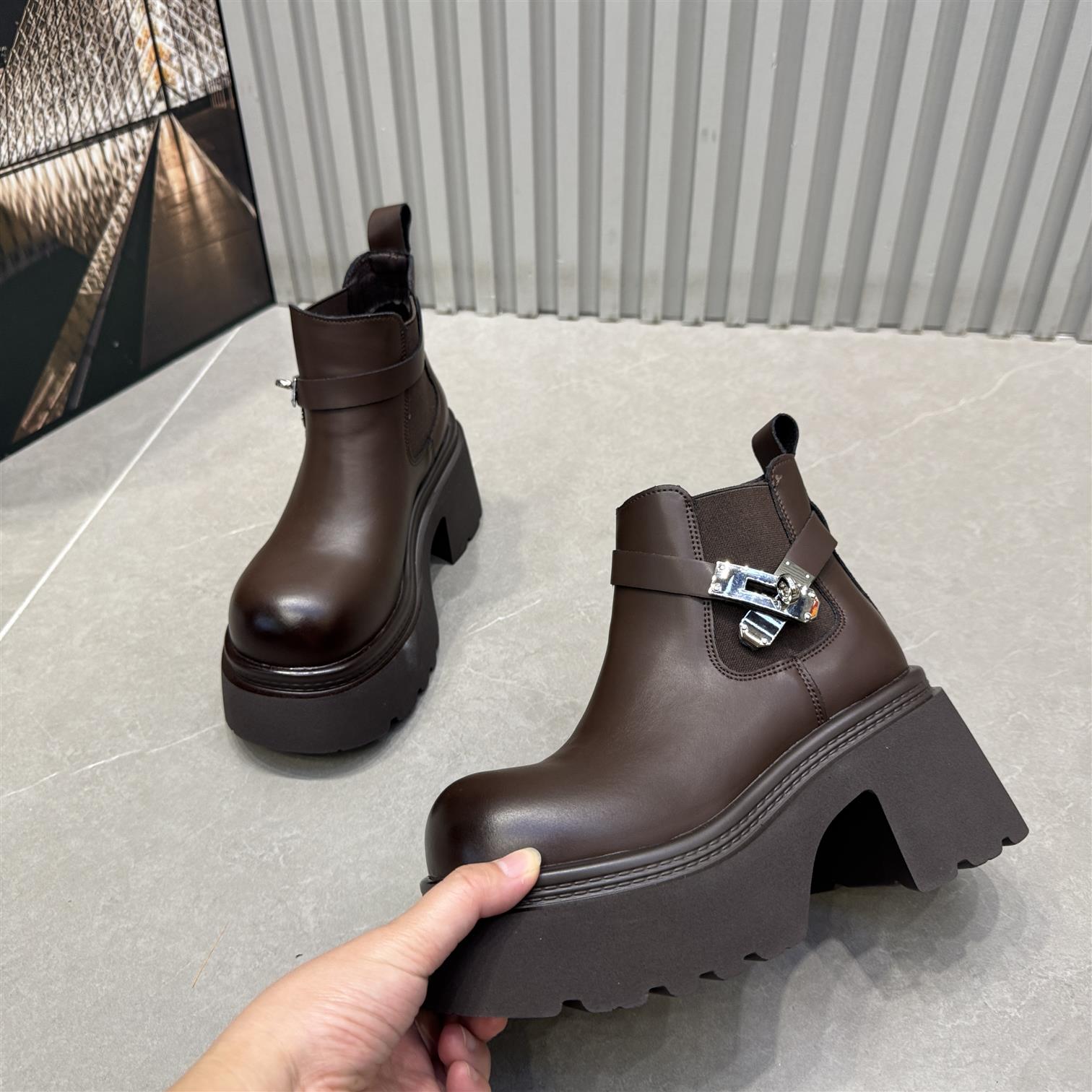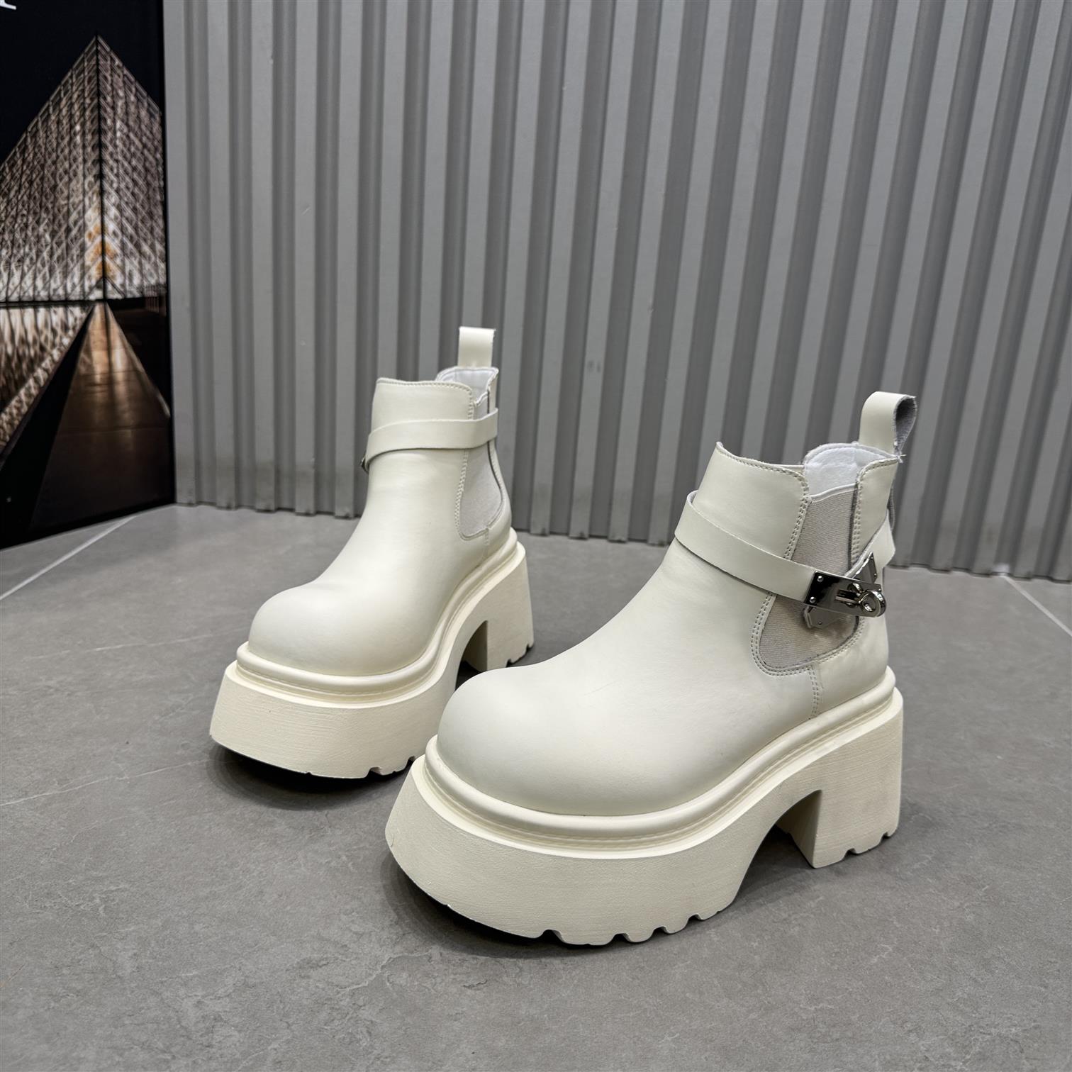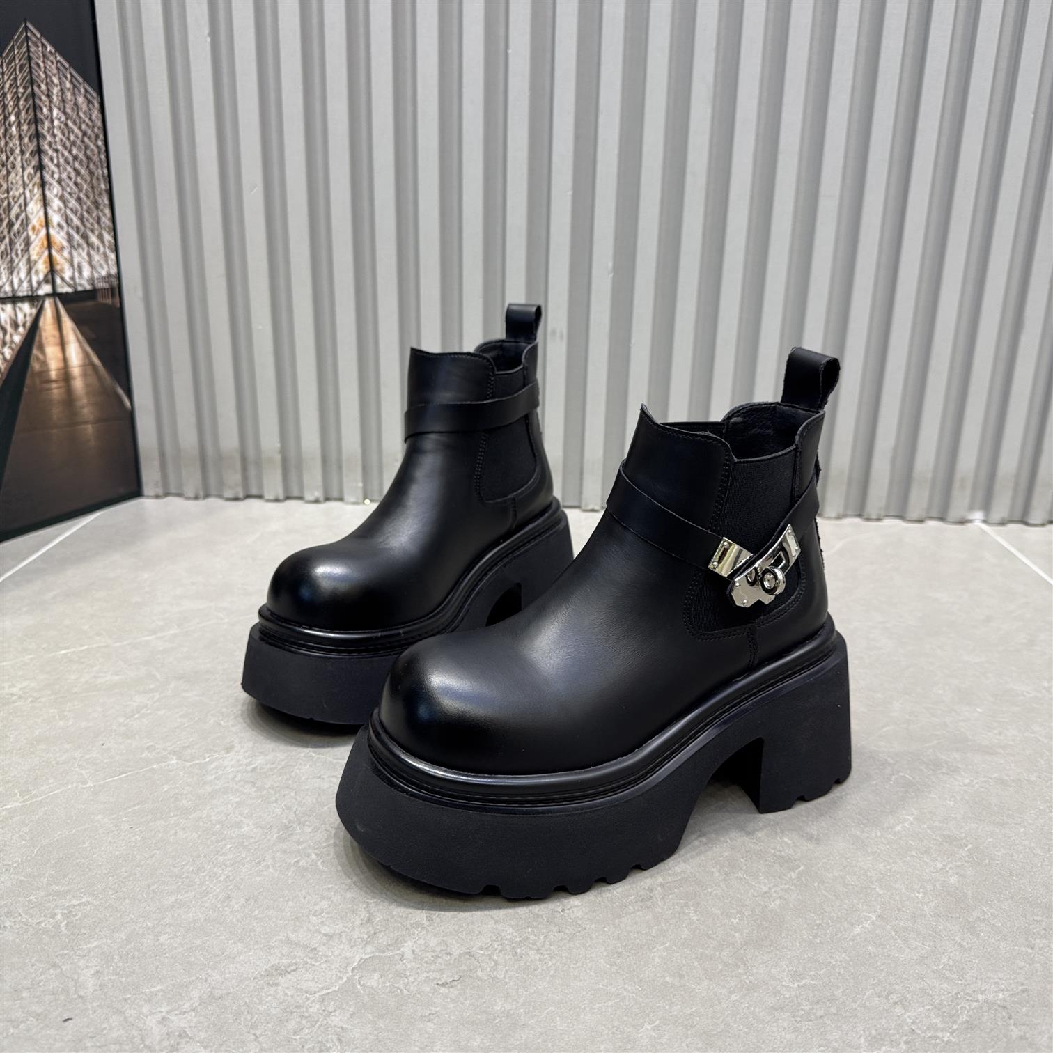 真皮粗跟爆款切尔西短靴女厚底高跟鞋2025新款显瘦粗跟烟筒马丁靴