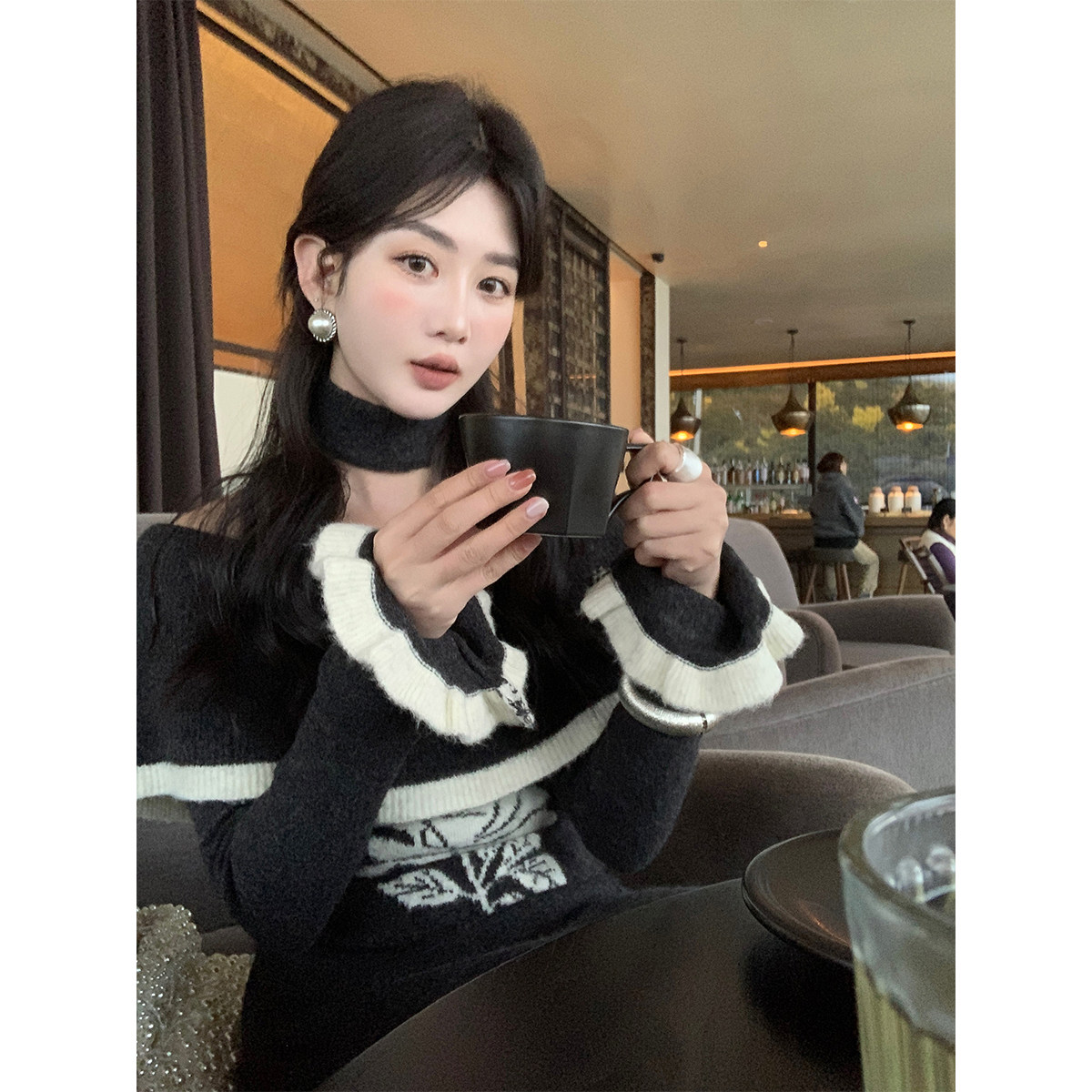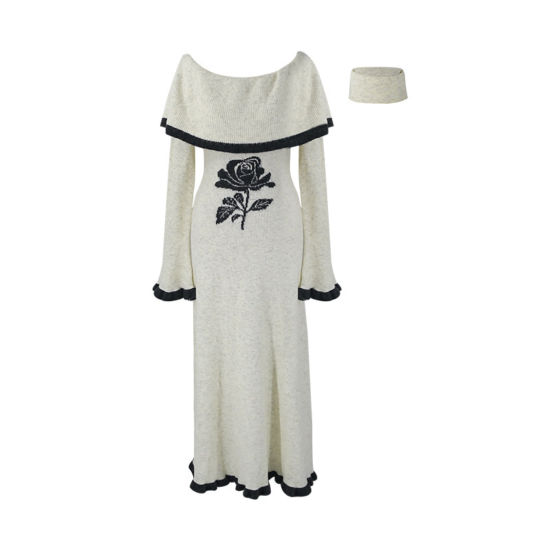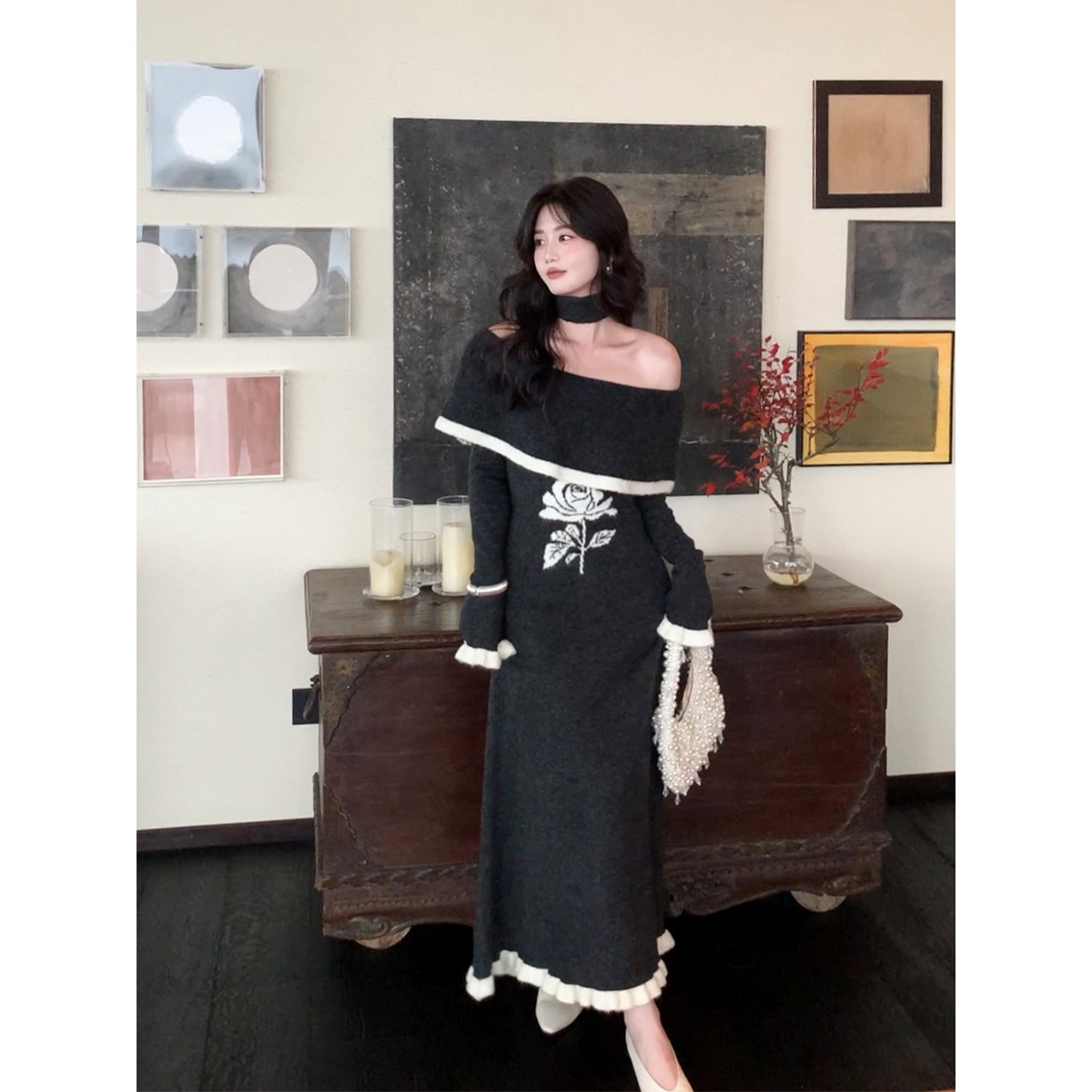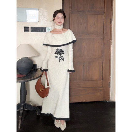 SYT自制 大圆领围脖花朵羊毛针织连衣裙女冬喇叭袖收腰A型修身裙
