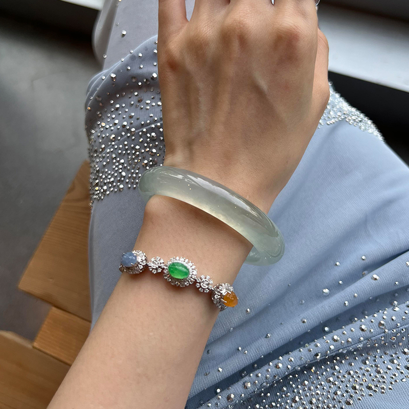 "曲苑风荷"缅甸高端翡翠飘花玉手镯子女款正品贵妃镯冰种玉石处理