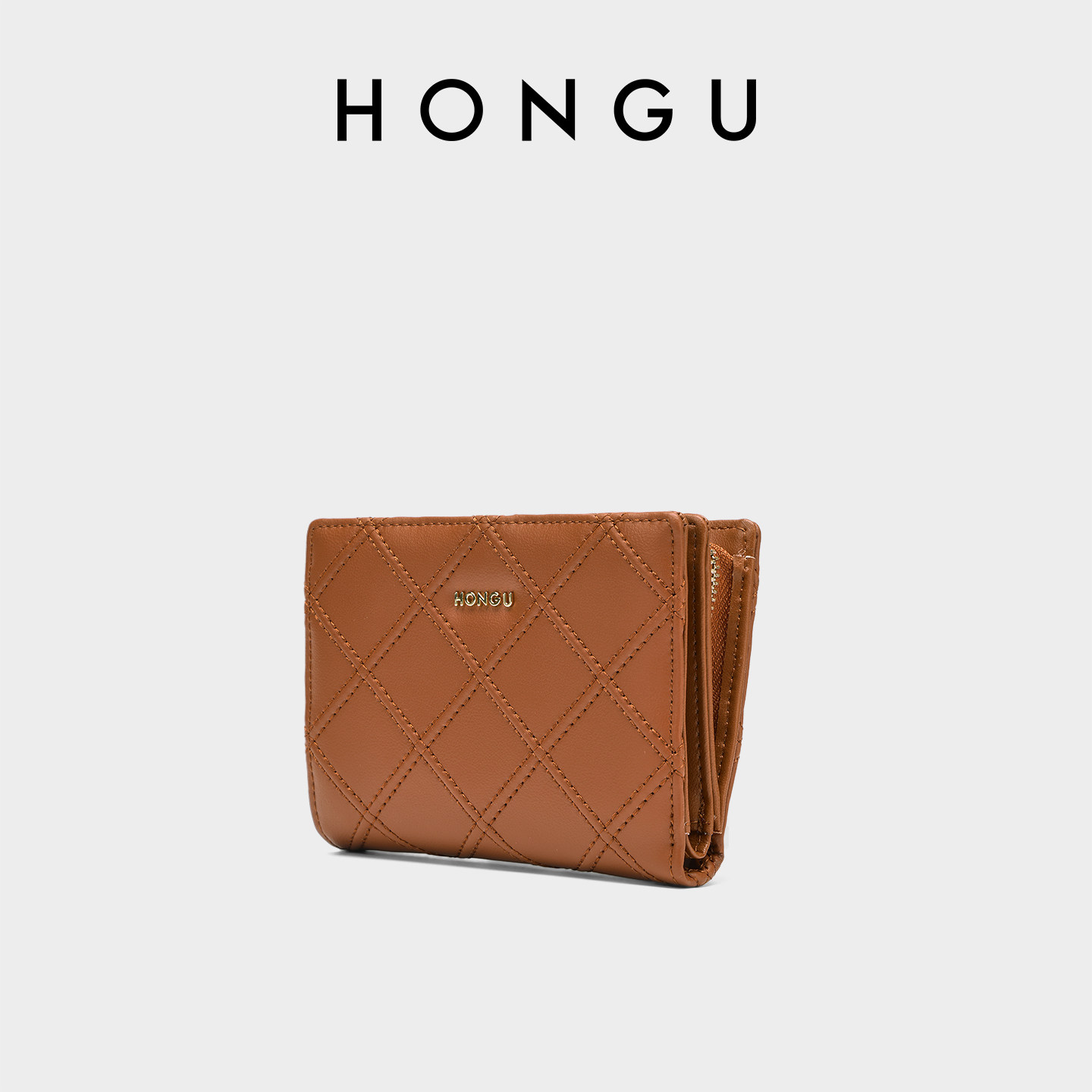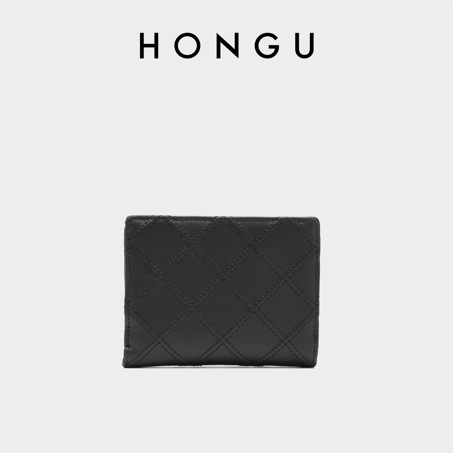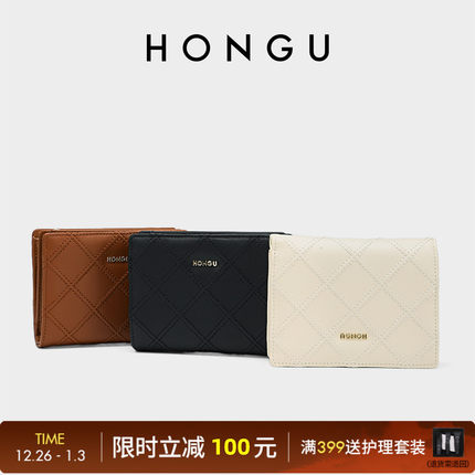 HONGU/红谷牛皮钱包女短款折叠迷你薄款钱夹时尚菱格零钱包皮夹包