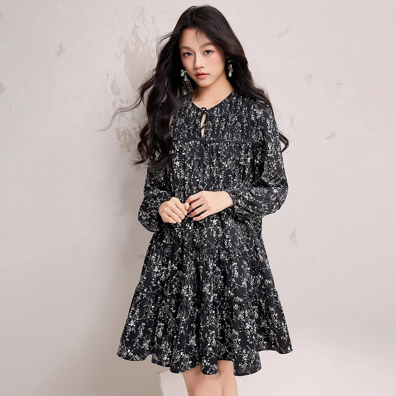 浪漫复古碎花大码连衣裙女2025春季新款优雅系带圆领长袖连身裙
