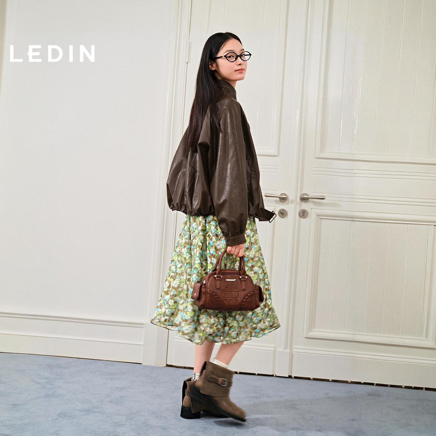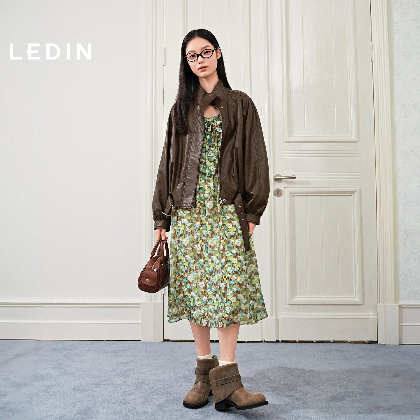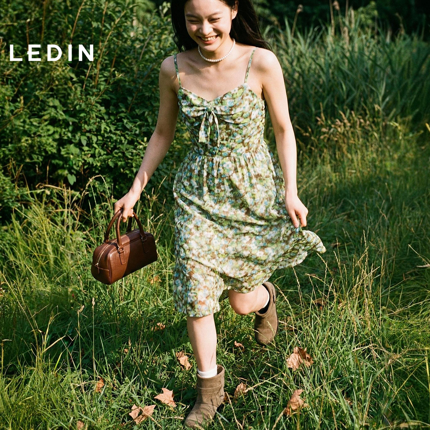 乐町蝴蝶结碎花吊带连衣裙女装2026春夏新品收腰轻微肌理感裙子