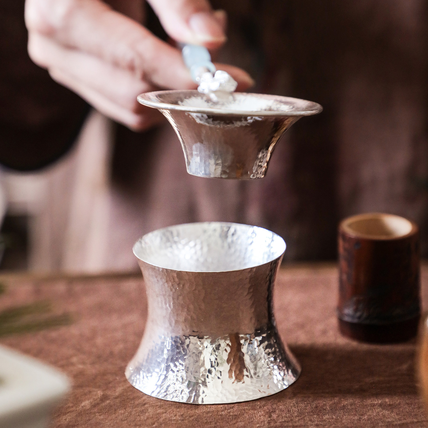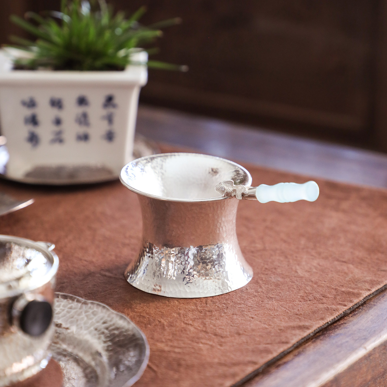 纯银时代 亮面锤纹茶滤架托纯银家用茶器足银999茶漏托底座银茶具