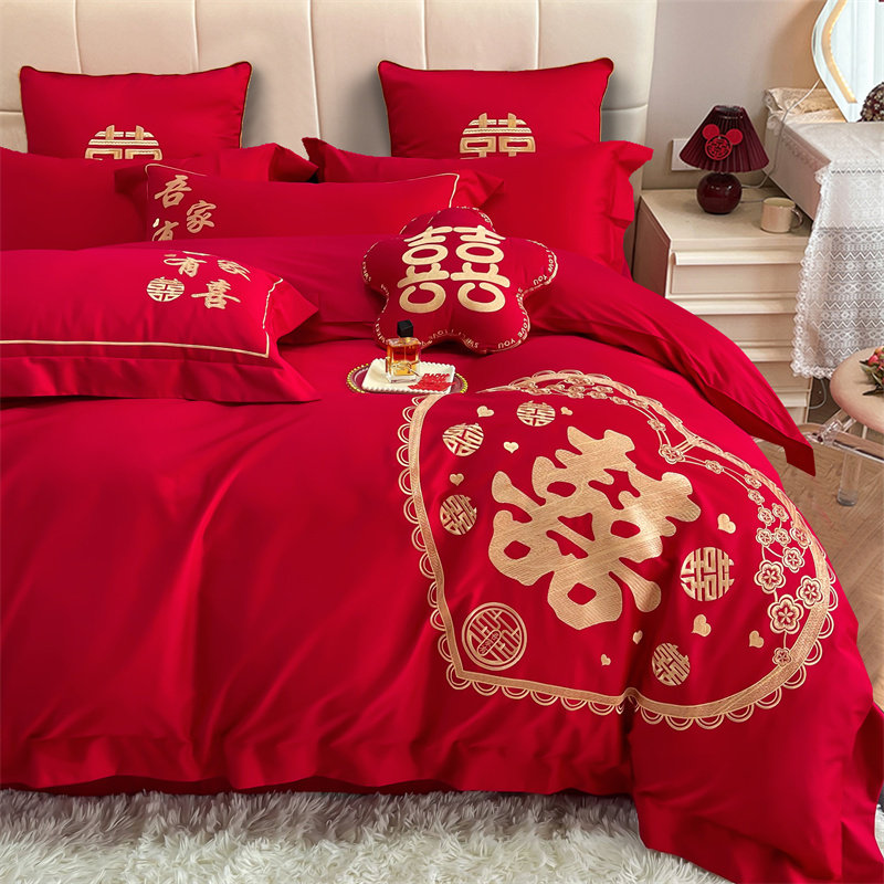 结婚四件套100全棉牀单婚庆牀上用品全棉大红色喜被新婚嫁房4