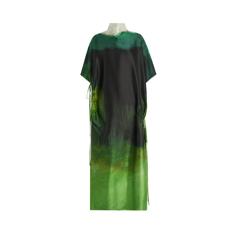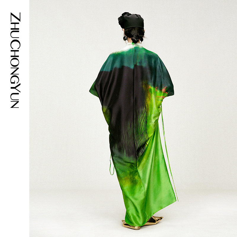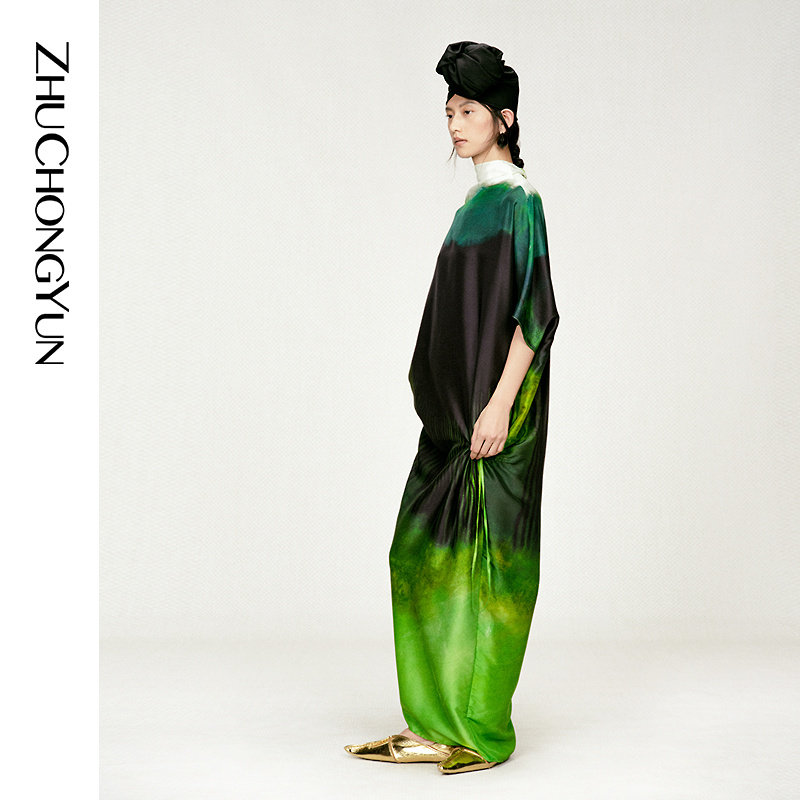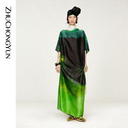 【春拂翠影】ZHUCHONGYUN2026春新款立领真丝印花宽松长款连衣裙