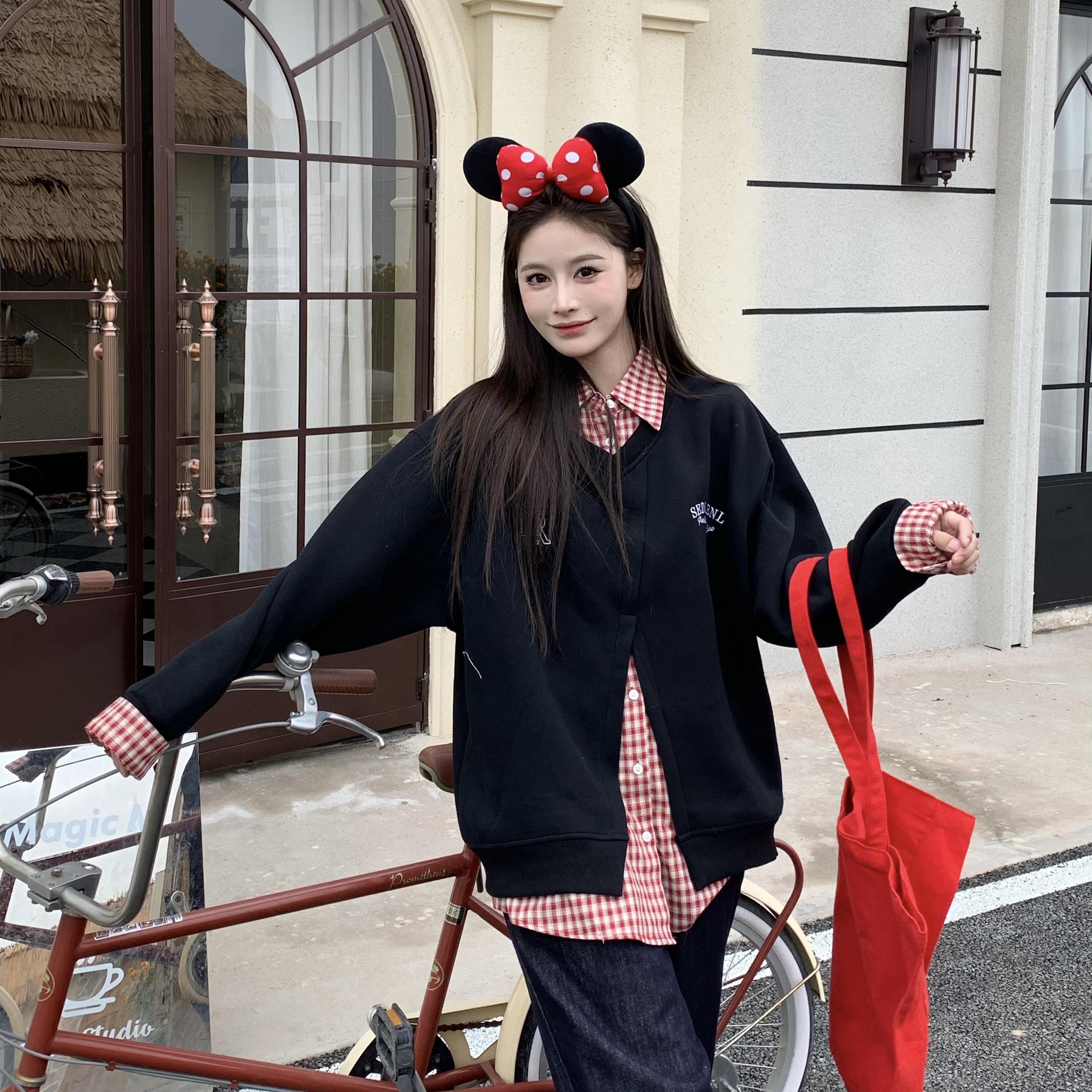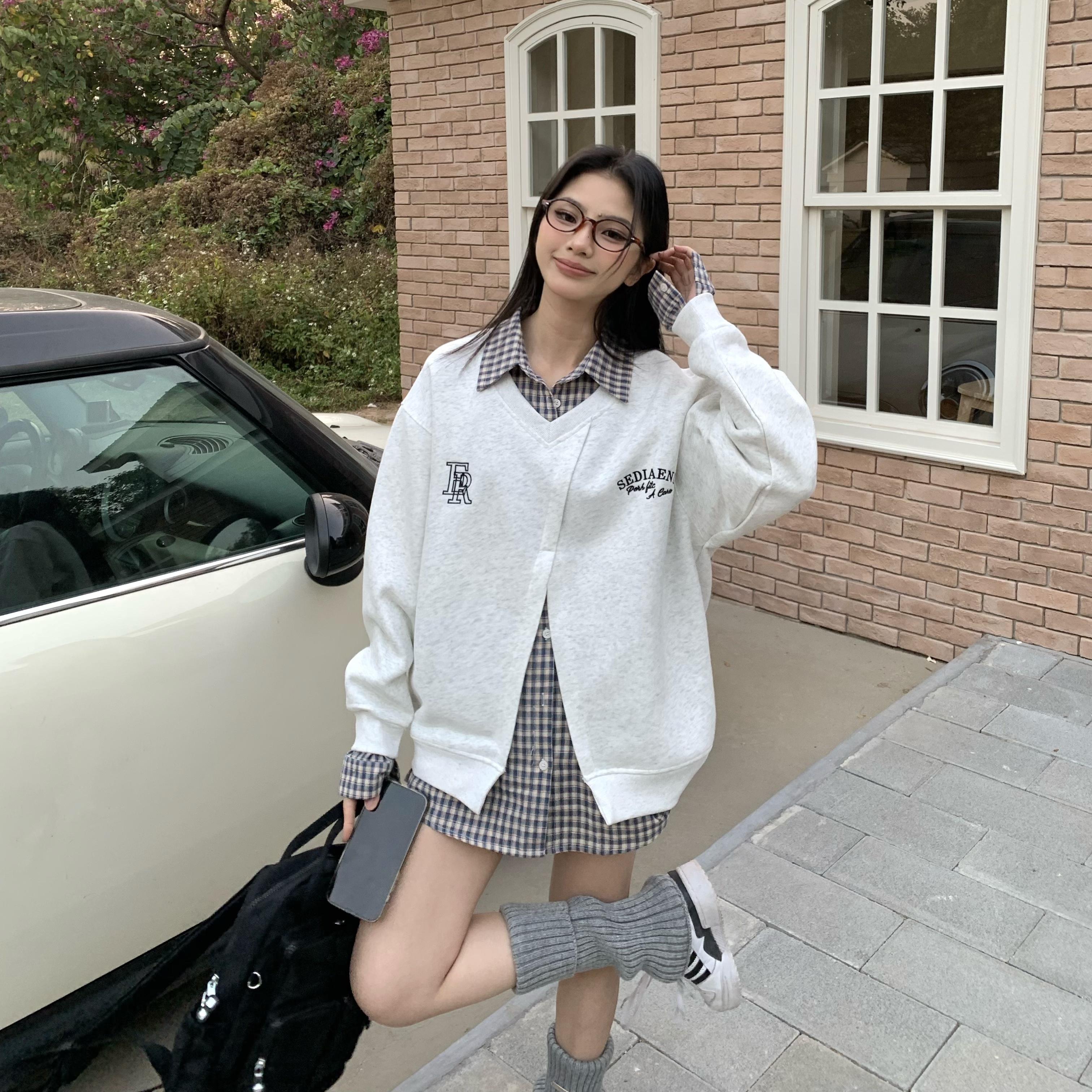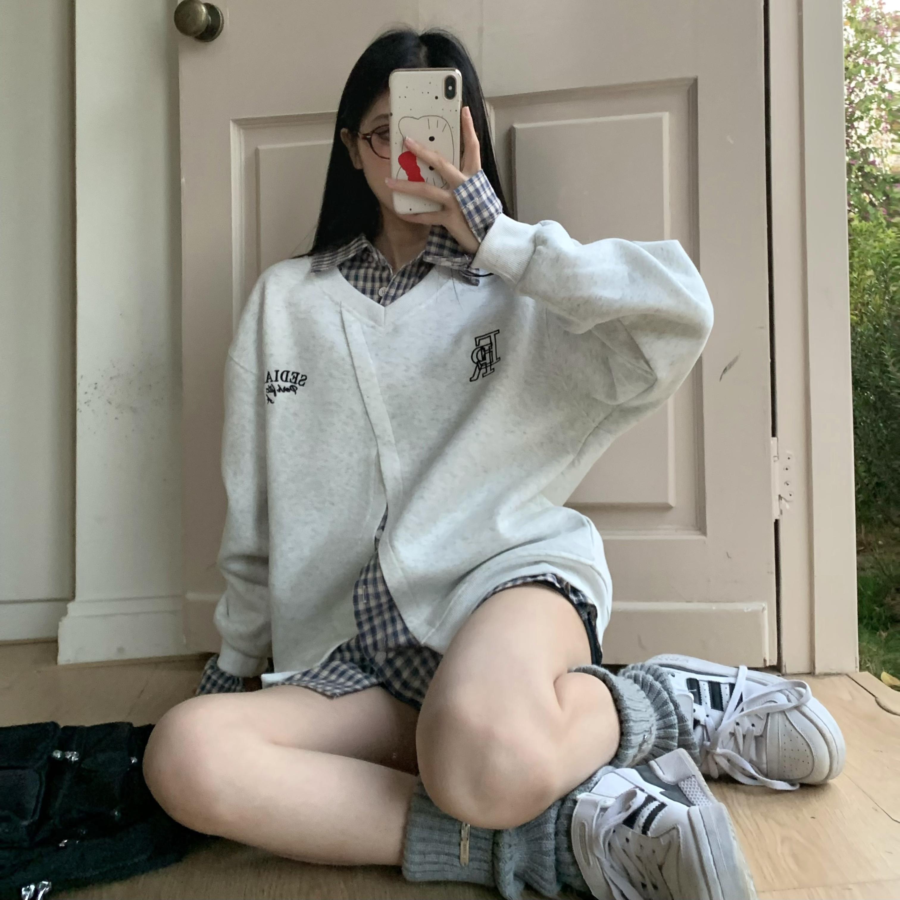 3MER哦哦三妹美式复古学院风假两件卫衣女宽松刺绣POLO领衬衫上衣