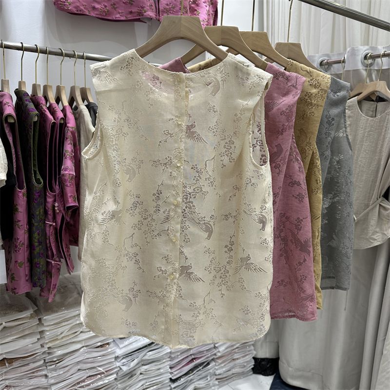 国风提花衬衫女无袖提花刺绣上衣2025夏新款圆领显瘦百搭马夹背心