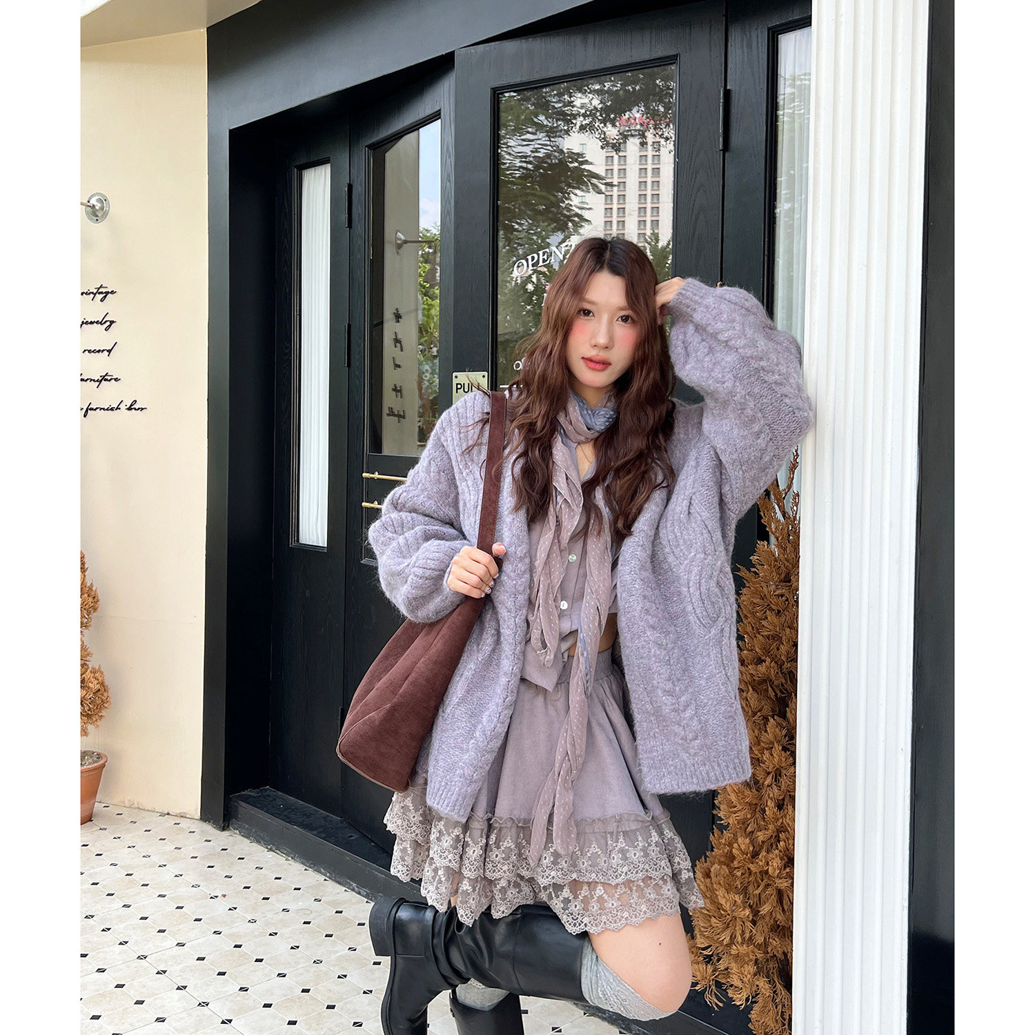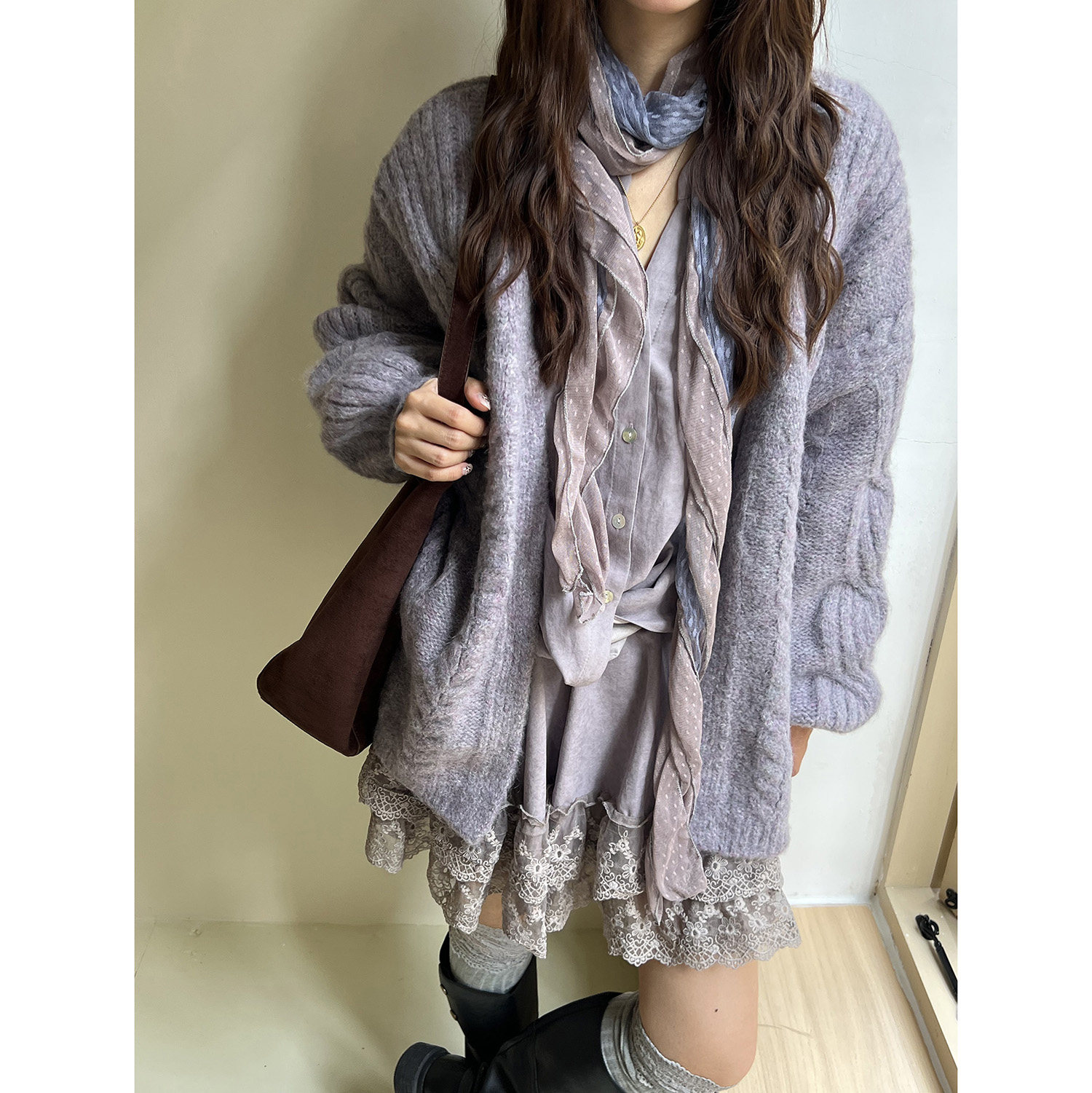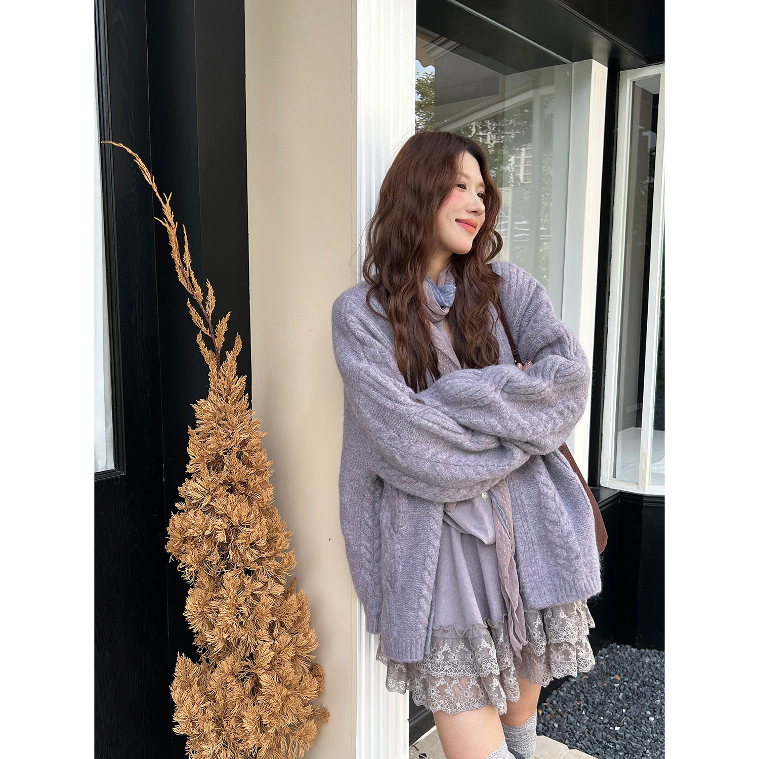 宝珠 韩系温柔紫色复古麻花针织毛衣开衫外套女中长款宽松慵懒感
