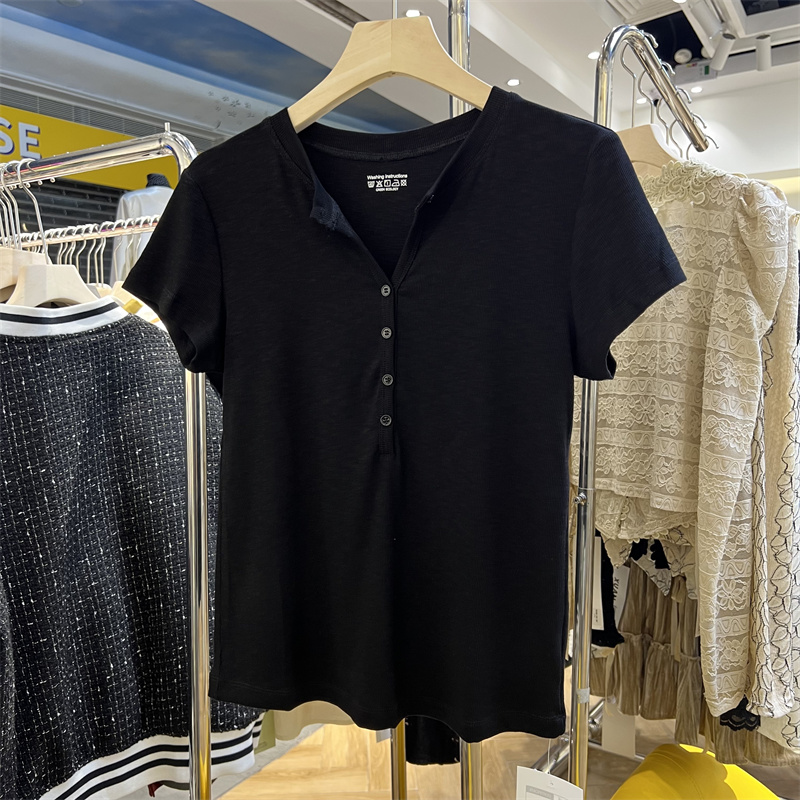 三可新品夏季纽扣纯棉罗纹短袖T恤女修身半开领小个子打底衫上衣