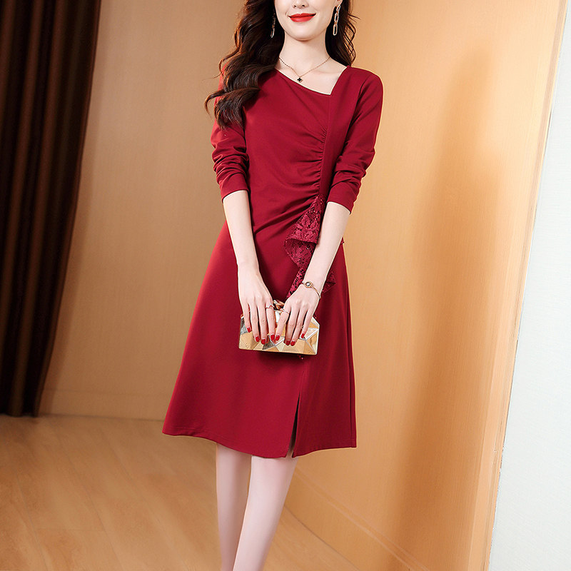 酒红色名媛气质礼服连衣裙女长袖2025春夏新款喜庆收腰显瘦中长款