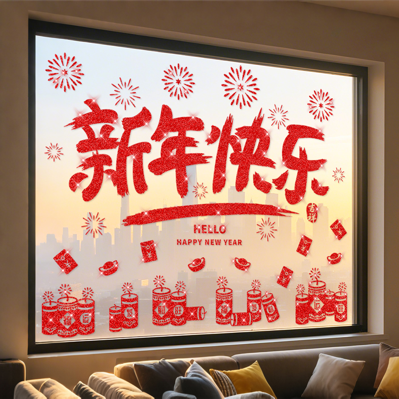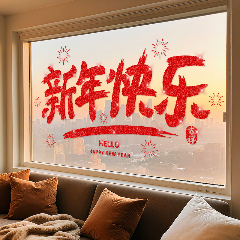 马年新年装饰品静电贴新年快乐福字贴过年布置窗花玻璃门贴画