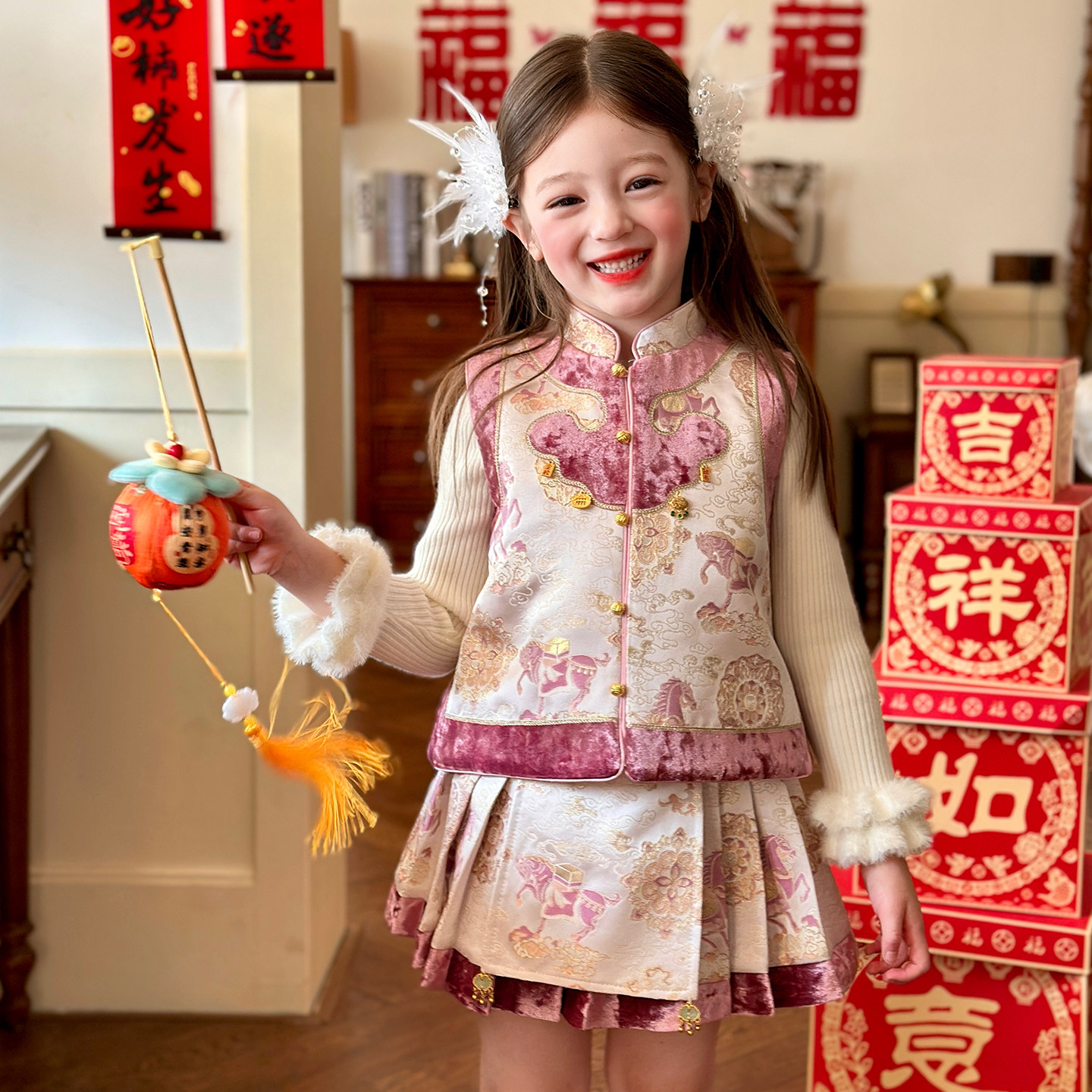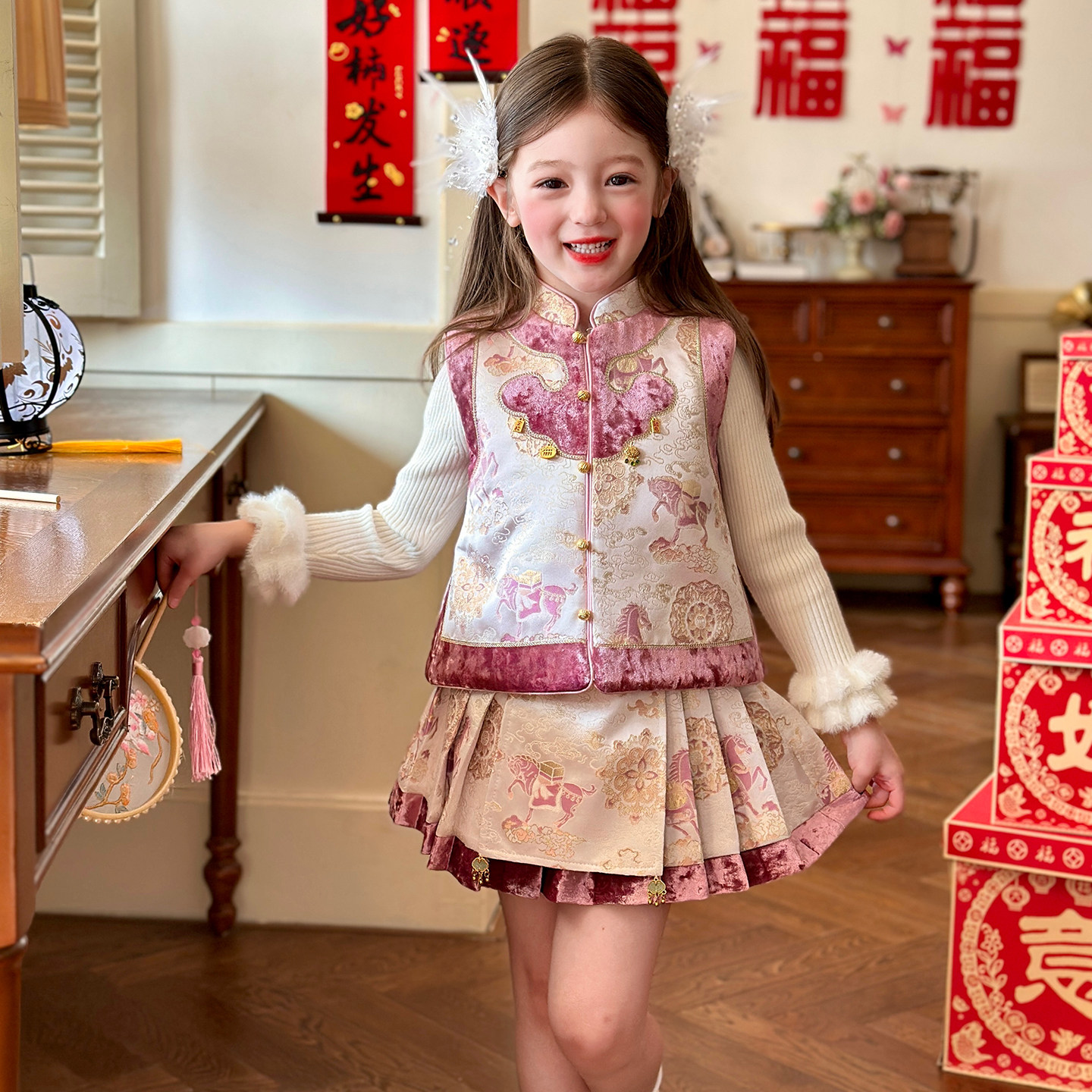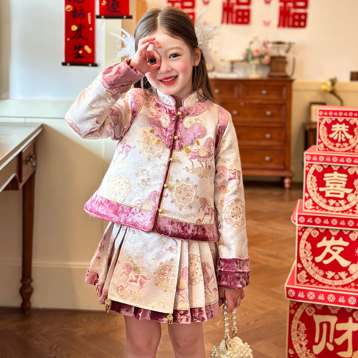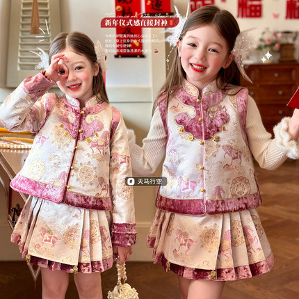 栀了成长记女童装国风夹棉套装2025冬季儿童新中式甜美加厚两件套