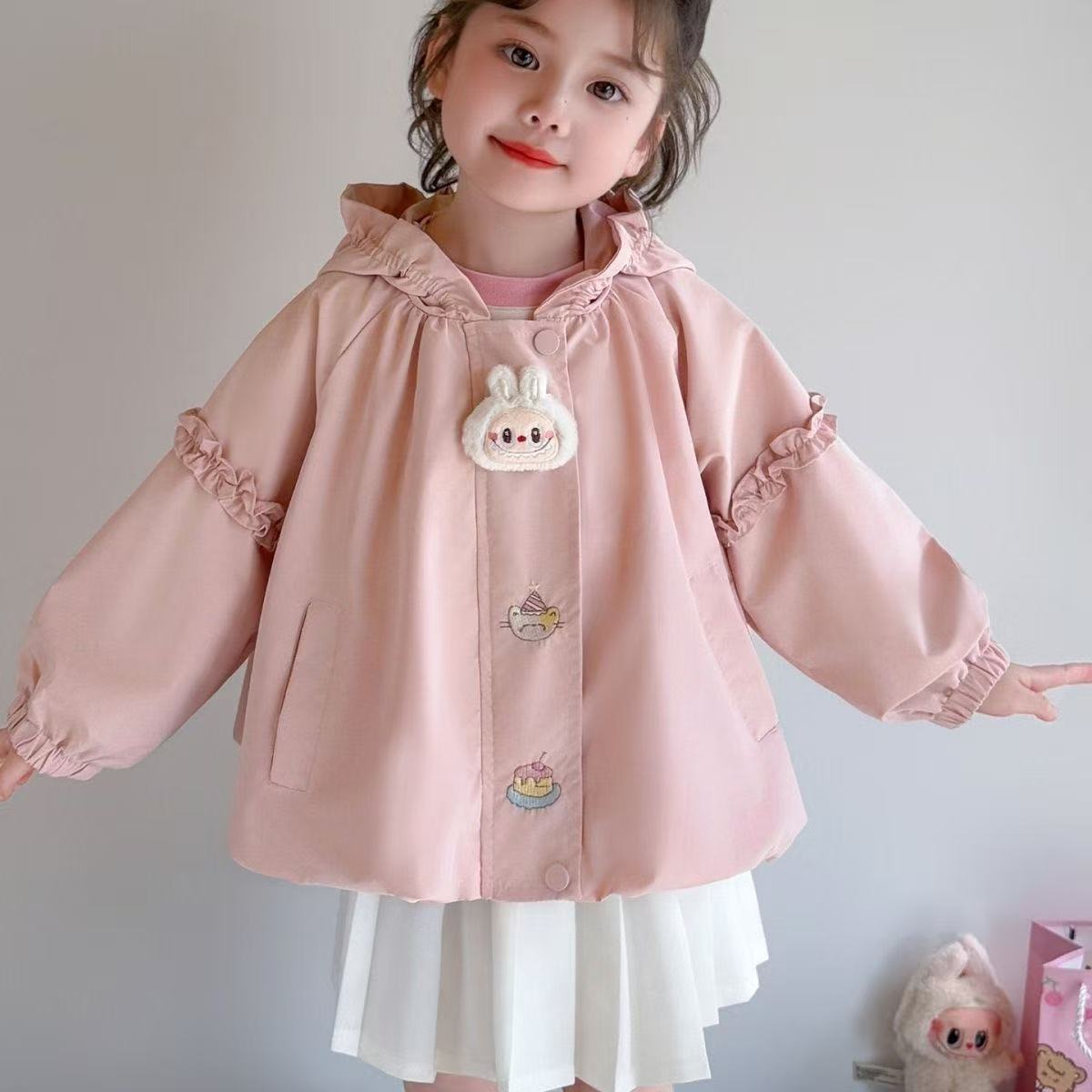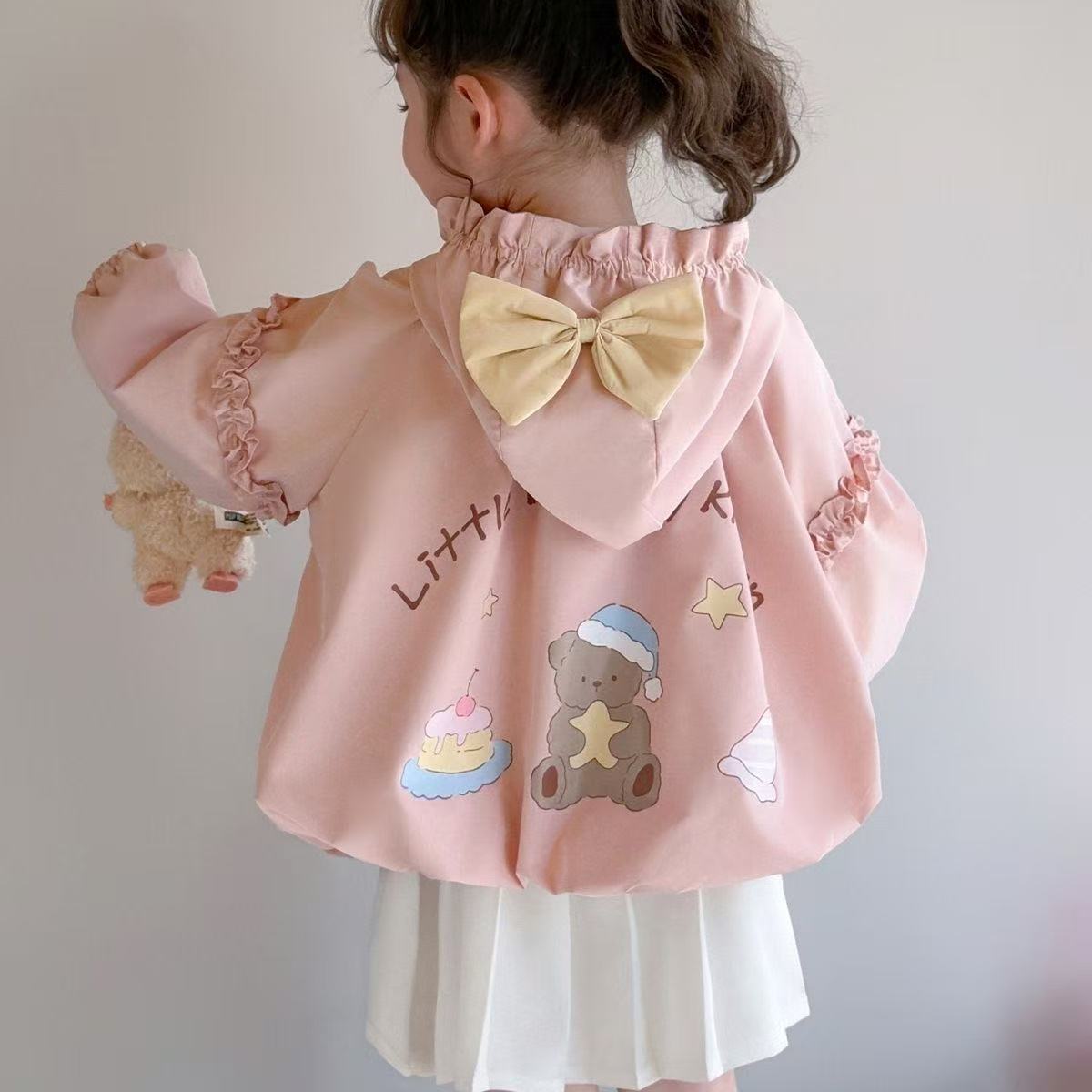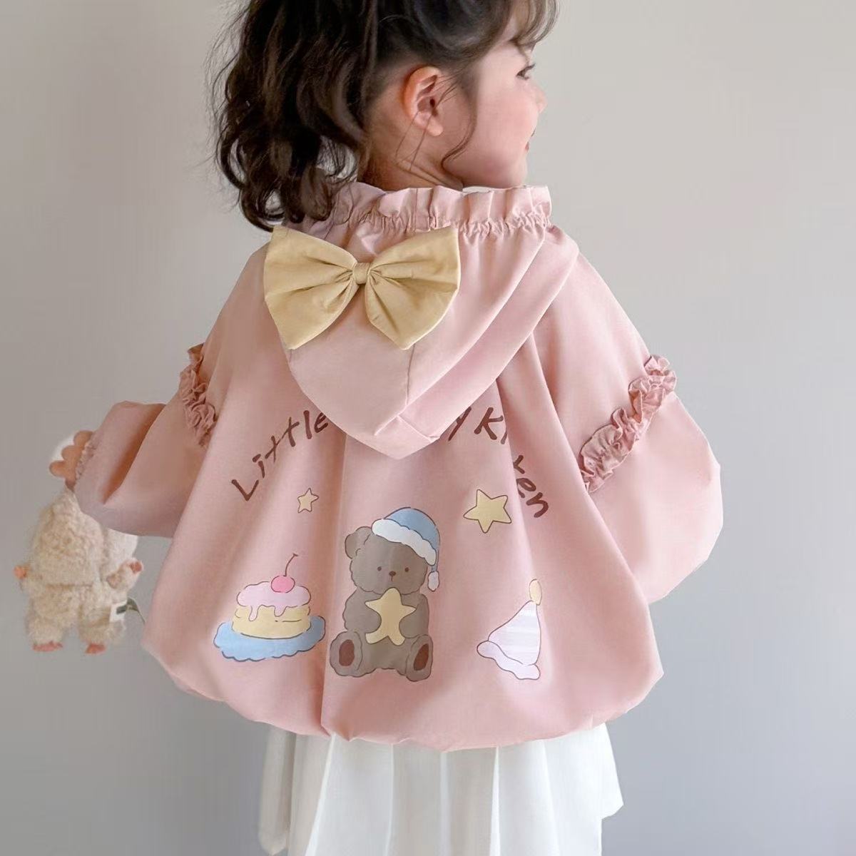 女童蝴蝶结外套春秋款女宝宝洋气韩版风衣秋装儿童卡通连帽上衣潮