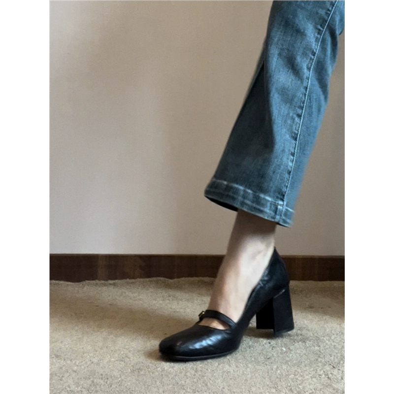 法式玛丽珍高跟鞋女春秋新款粗跟方头黑色小皮鞋一字带浅口单鞋秋