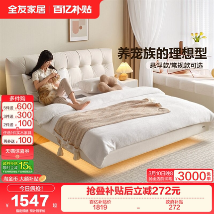 全友家居奶油风女生悬浮床2025新款卧室家具双人泡芙猫抓布艺床