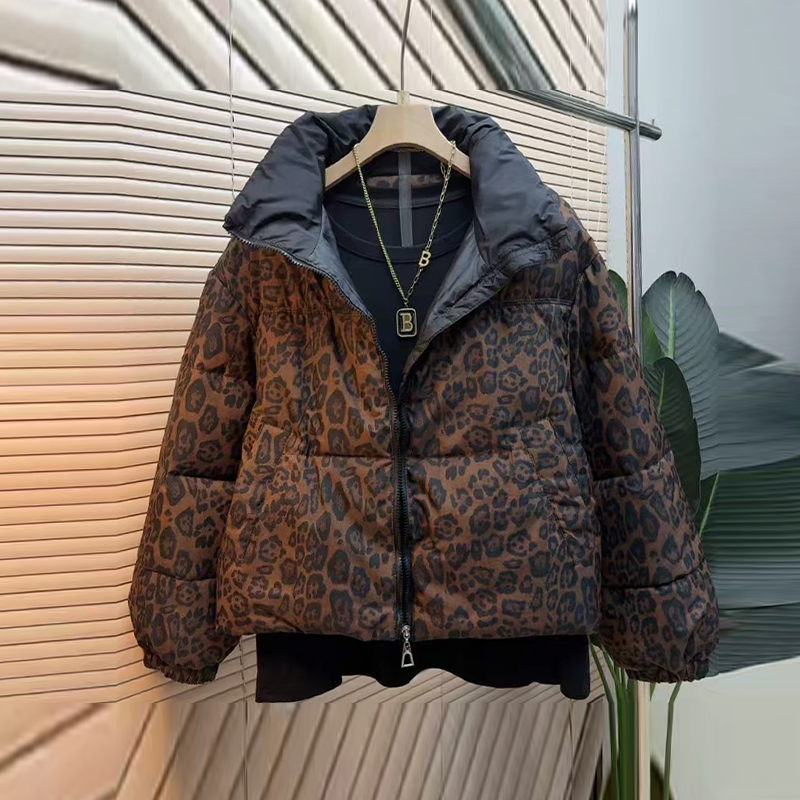 胖MM加肥立领长袖豹纹棉服大码女装2025冬季款欧洲站洋气保暖外套