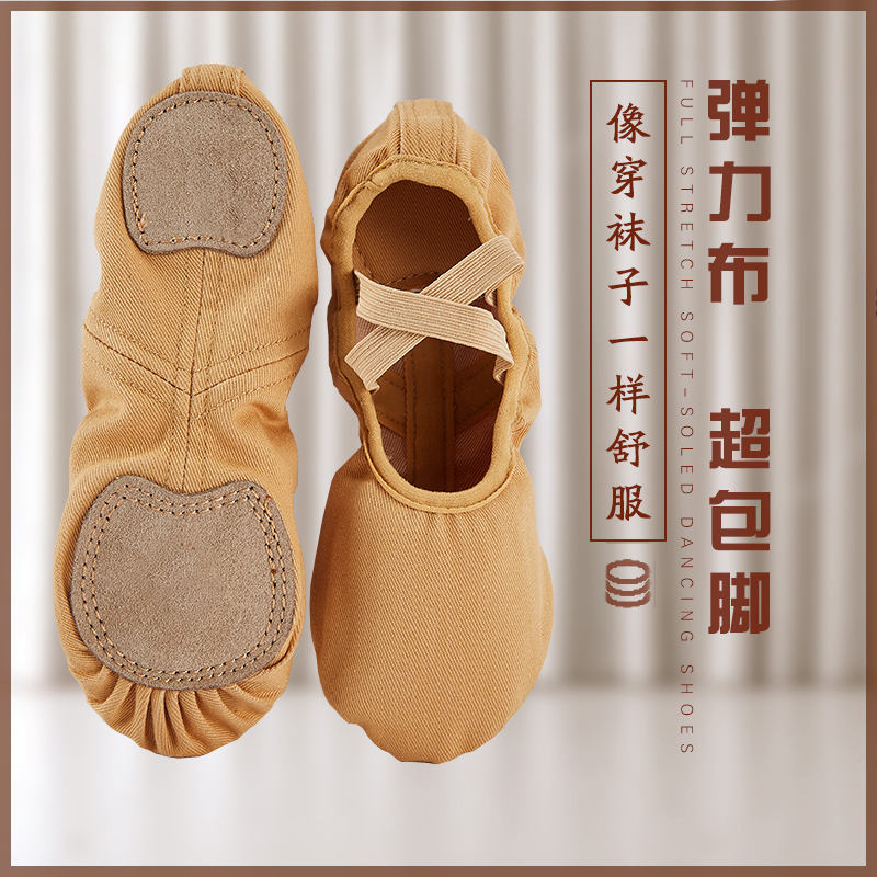 全弹力布舞蹈鞋女软底儿童成人免系带练功猫爪鞋专业芭蕾舞鞋驼色