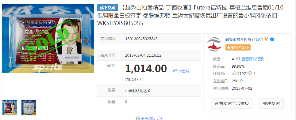 【越秀山卡价书】英格兰维恩鲁尼01/10低编限量白板签字