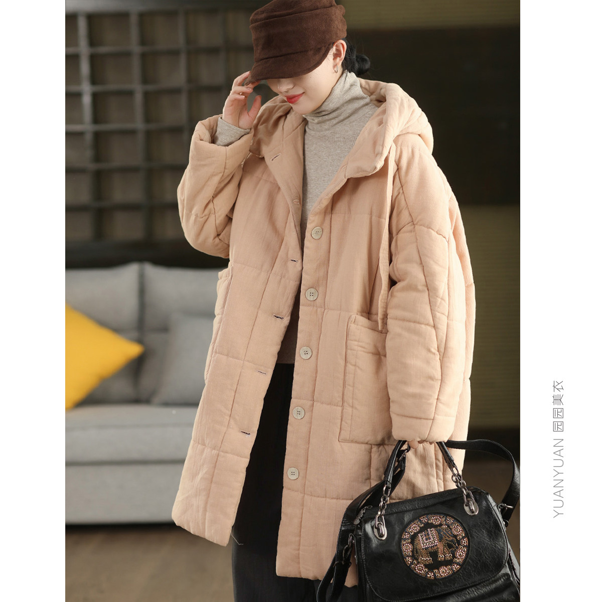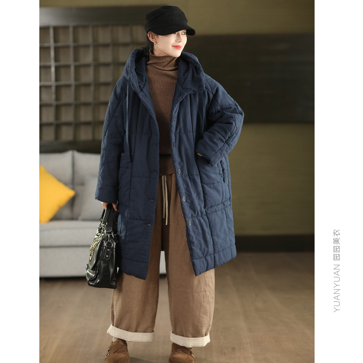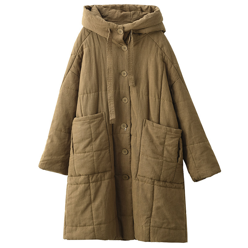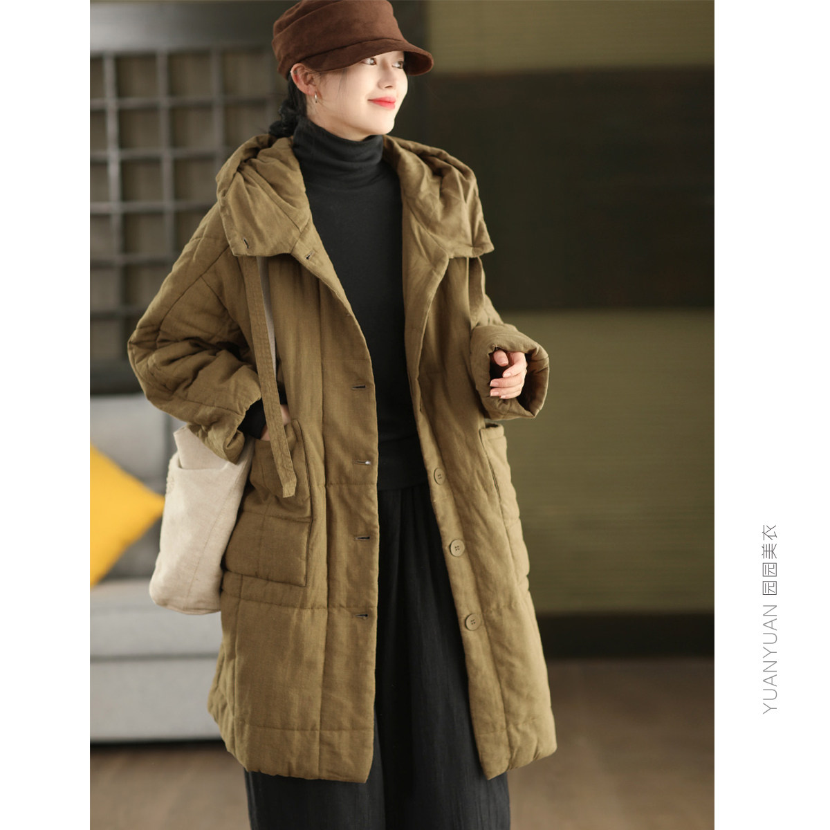 冬季重工天丝苎麻长款夹棉外套女棉衣文艺大口袋加厚保暖棉袄棉服