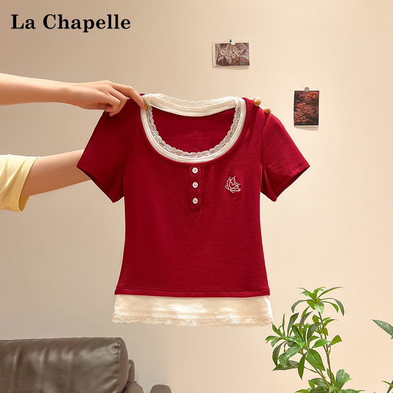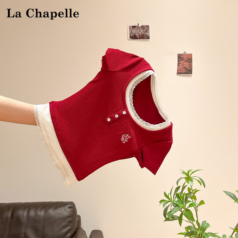 拉夏贝尔韩系蕾丝花边假两件短袖t恤女夏季2025新款红色减龄上衣