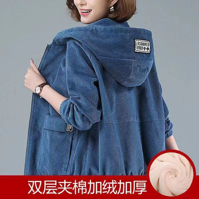 灯芯绒短款外套女秋冬韩版宽松2025新款大码连帽休闲中年妈妈夹克