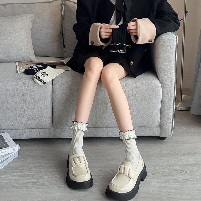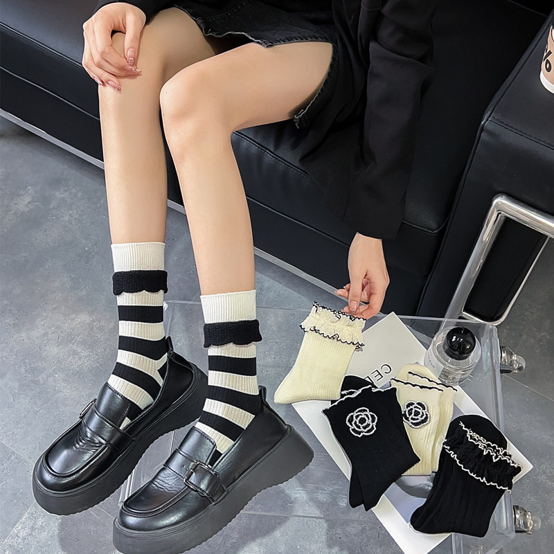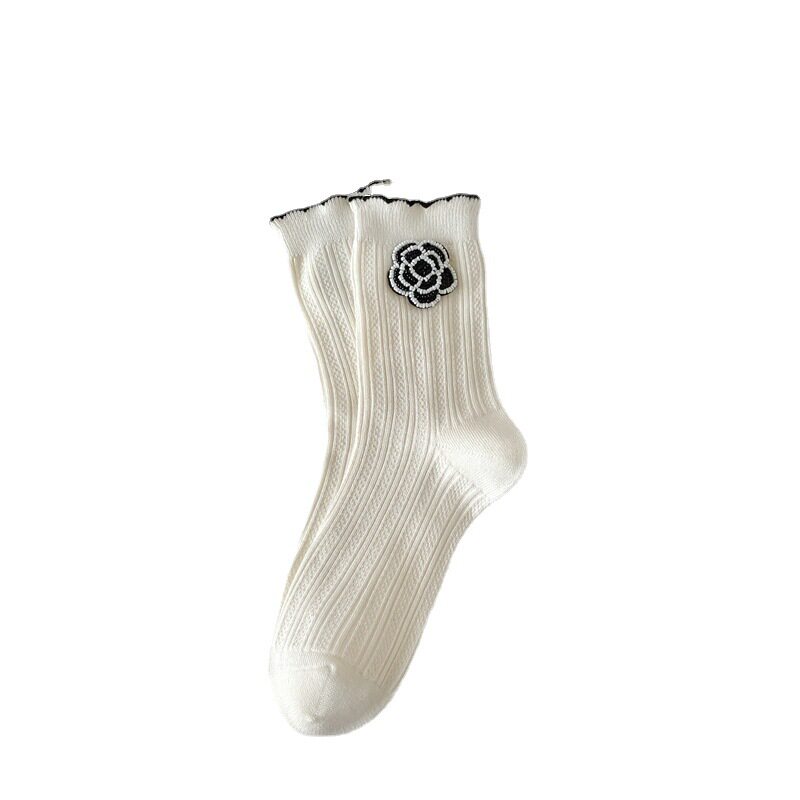 2026春夏新款竹棉黑白装饰珠子花朵女士花边甜美中筒袜子女袜