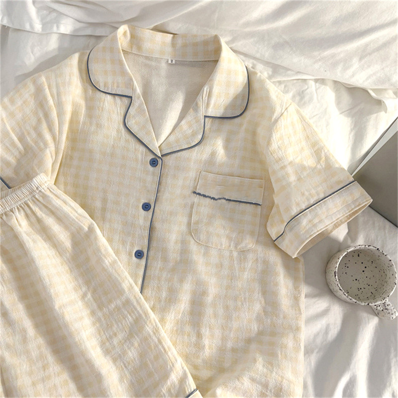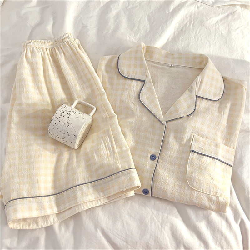 『格子控!』日系甜美网红风睡衣女纯棉绸棉纱短袖夏季薄款家居服